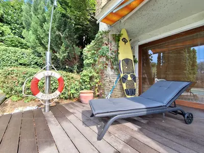 A hátsó kertben egy épített szaletli és gyermekbarát játszótér, míg az első részen egy kinyitható napellenzős terasz található, amely közvetlen összeköttetésben áll a beltéri wellness részleggel.