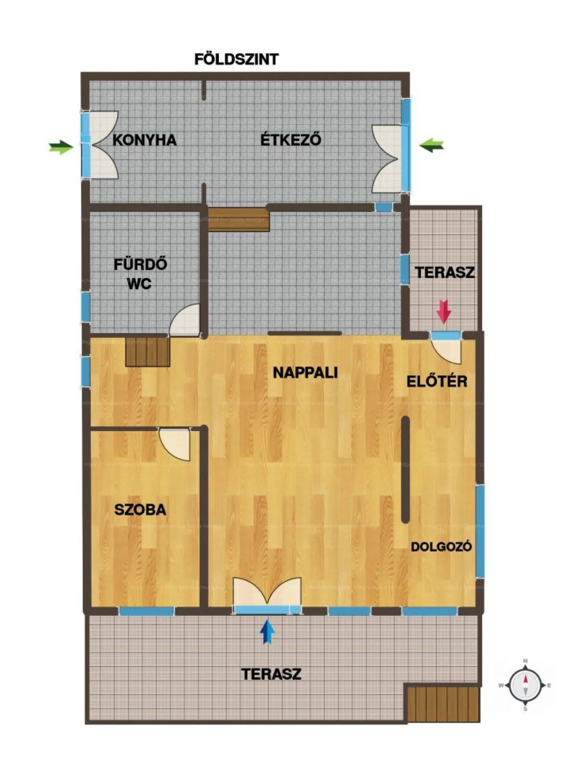 Alsó szint 26.85 nm-es, ahol mosókonyha, teraszos, kertkapcsolatos szoba és 2 tároló található.