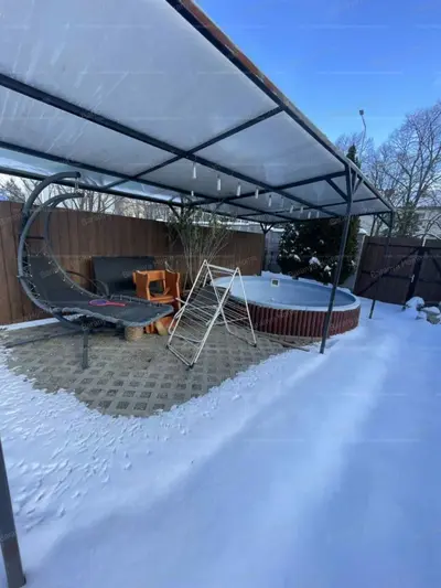 Külső adottságok: 13 m²-es fedett terasz, elektromos kapus, térkövezett kocsibeálló 3 autó részére (ebből 2 fedett), újszerű aknás garázs, lemez kerti tároló, parkosított kert beépített medencével, kerti tóval, grillezővel és kerti kiülővel.