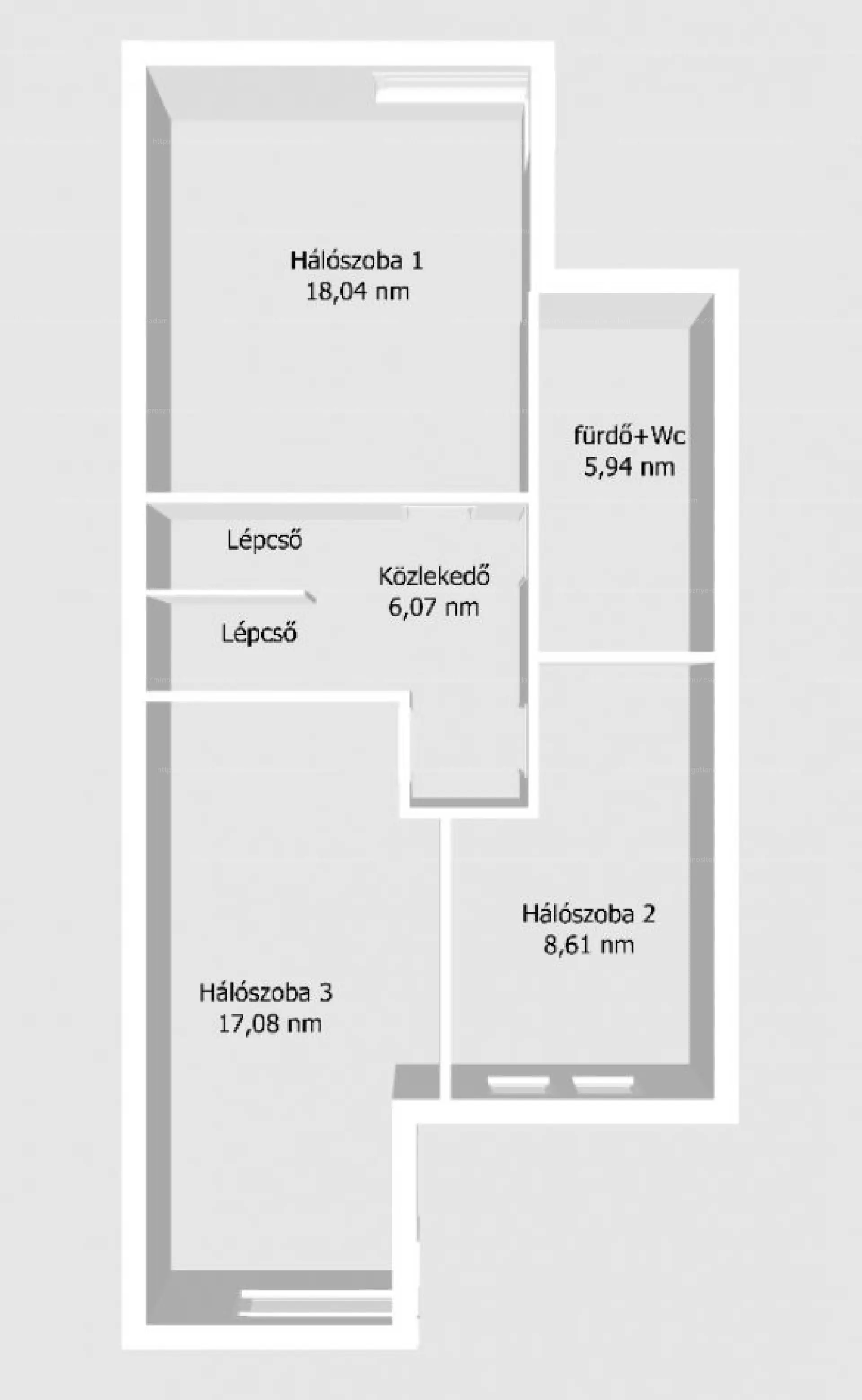 -Emelet: közlekedő, 3 háló és egy fürdőszoba.