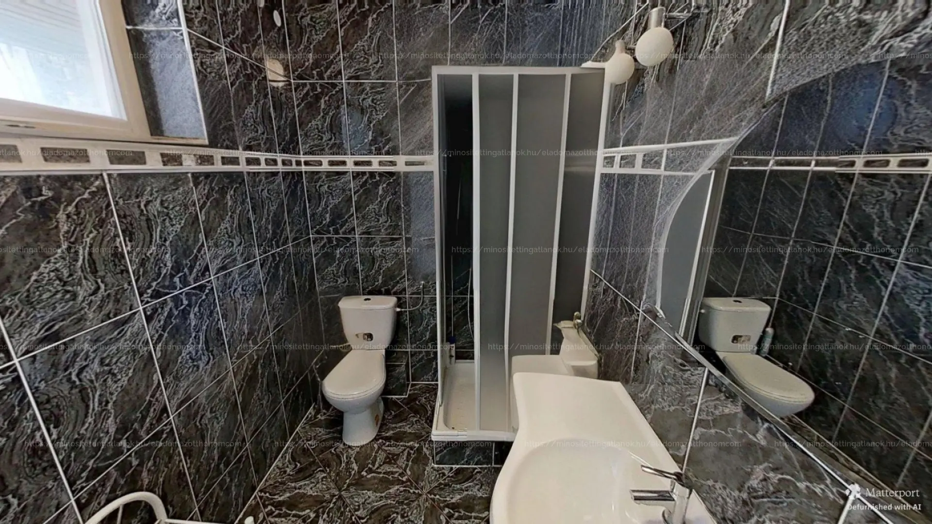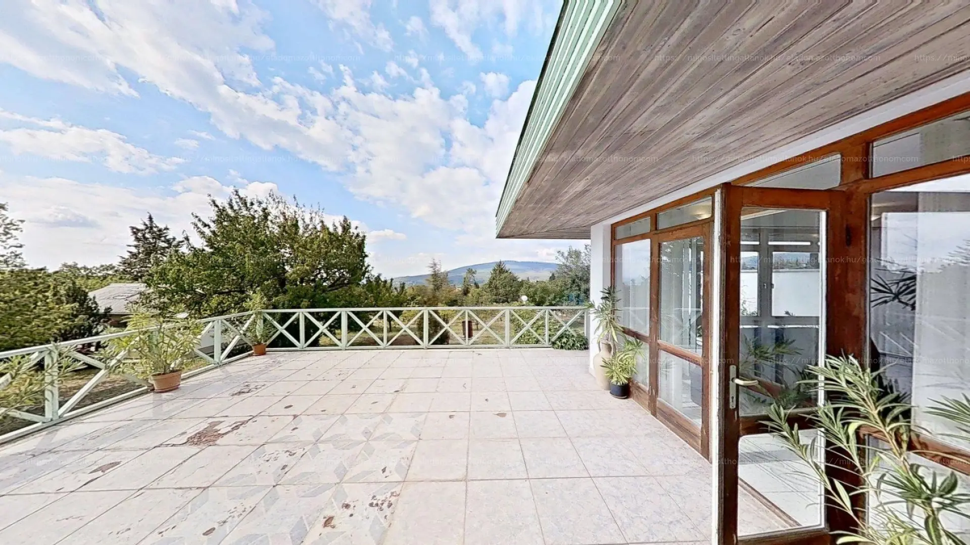 A középső, utcafrontról is nyíló, de a kertből két oldalról is megközelíthető szinten található a csodás panorámát nyújtó, 60 nm-es, kertre és a hegyekre néző terasz. Innen jó időben nem csak a Jakab-hegyet, de a horvát hegységeket is látni.