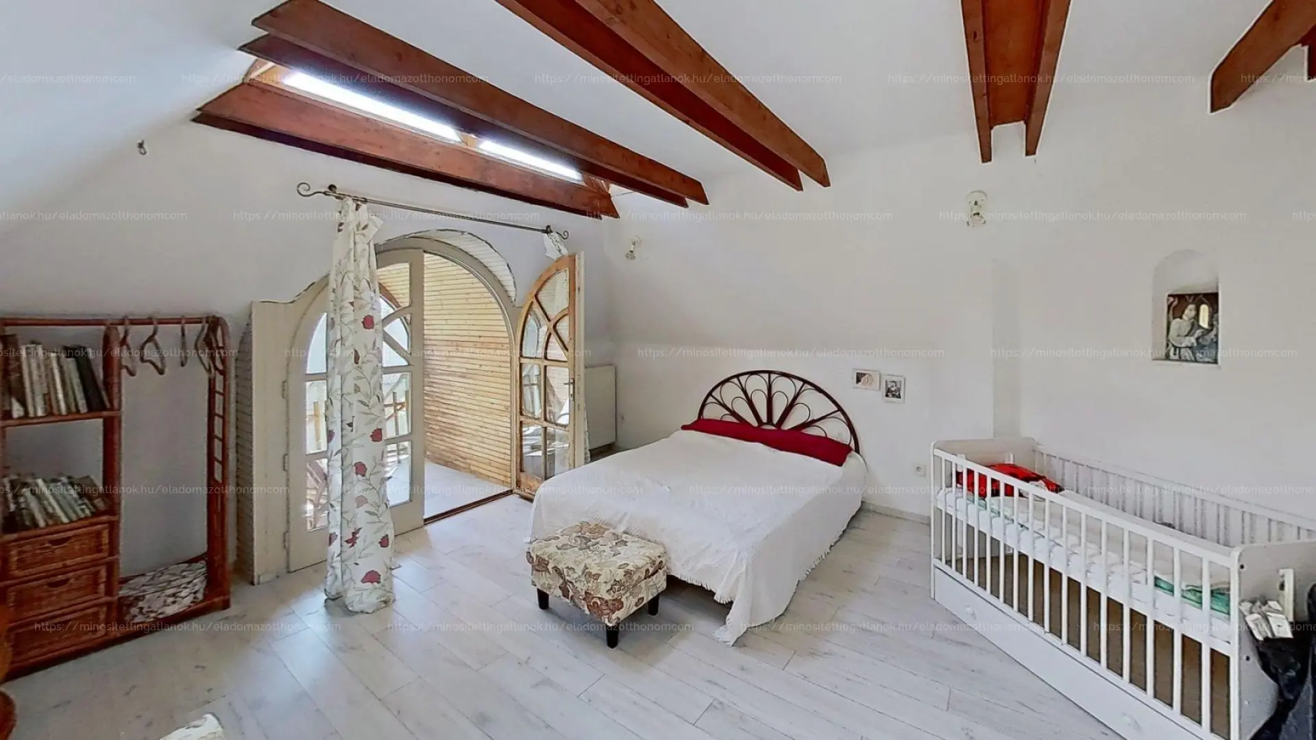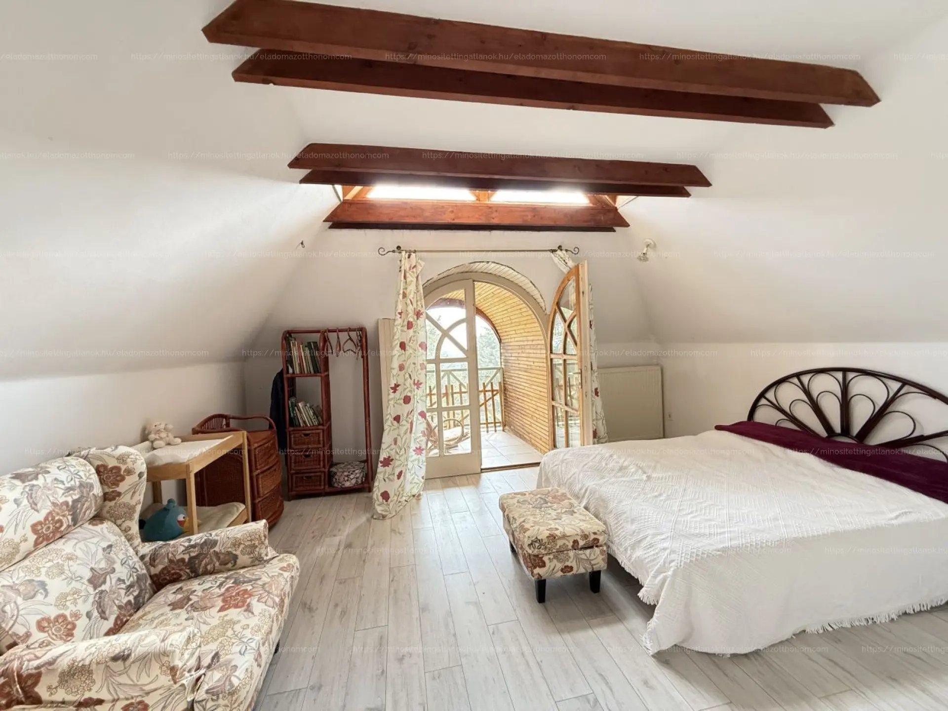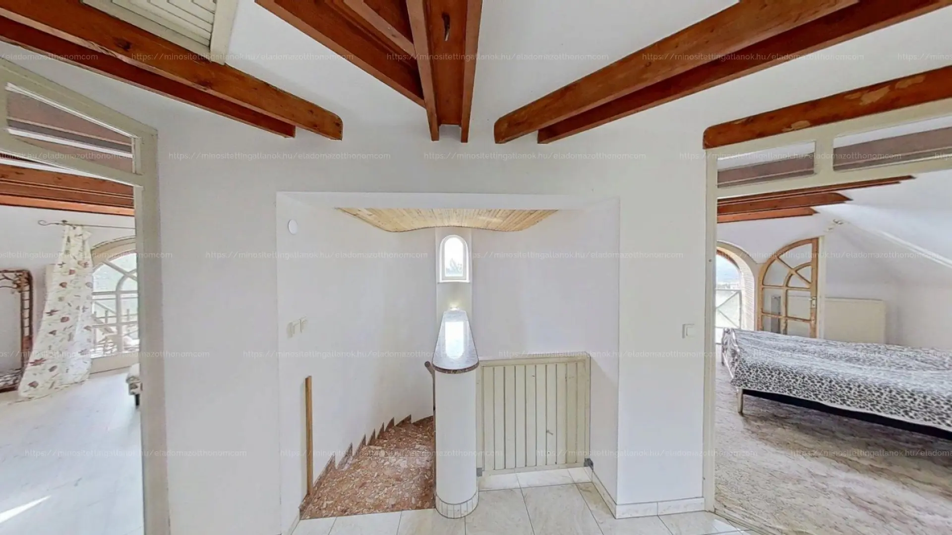 Az emeleti szinten három hálószoba (22, 25 és 14 m²), valamint egy 7 m²-es fürdőszoba található. A szobáknak egészen egyedi hangulatot adnak a zárt erkélyek, melyeken át lenyűgöző panoráma nyílik dél felé, a völgyben elterülő Pécs városára és a Nyugat-Mecsek vonulataira.