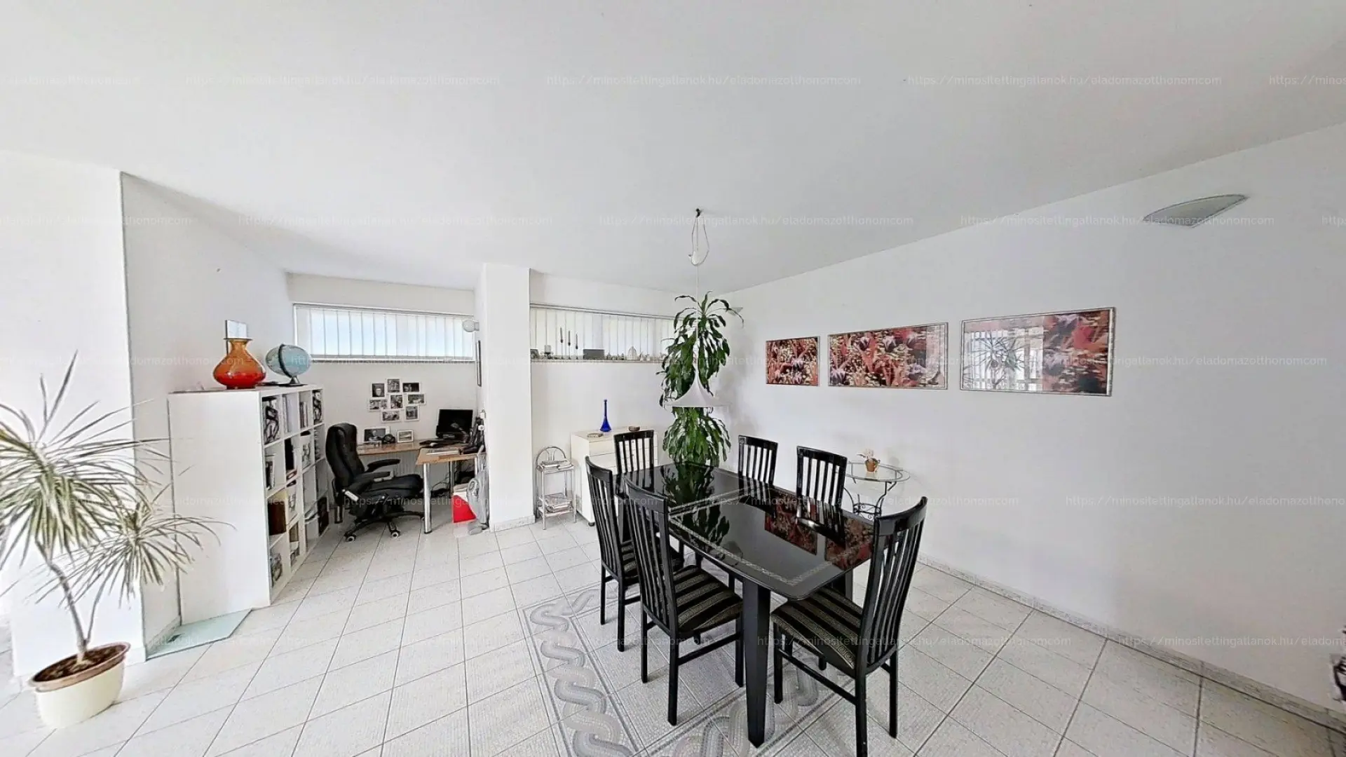 A terasz felé két oldallal is nagy üvegfelületekkel kapcsolódó, 22 nm-es nappaliból hasonlóan szép panoráma élvezhető. Innen egy légtérben, de jól elszeparálva egy 5 m²-es kis dolgozósarok, valamint egy 20 m²-es étkező egy található. Mellette kapott helyet a 13 m²-es konyha, melynek saját kijárata van a teraszra, és a terasz felőli fala szintén hatalmas üvegfelületekkel rendelkezik. A szinten található továbbá egy 5 m²-es fürdőszoba zuhanykabinnal, mosdóval és WC-vel. A főbejárat mellett kamra, valamint innen nyílik a 25 m²-es garázs is.