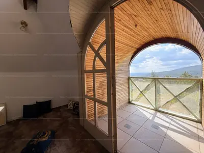A középső, utcafrontról is nyíló, de a kertből két oldalról is megközelíthető szinten található a csodás panorámát nyújtó, 60 nm-es, kertre és a hegyekre néző terasz. Innen jó időben nem csak a Jakab-hegyet, de a horvát hegységeket is látni.