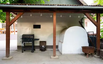 Kiterjedt fedett terasz terület kellemes fekvéssel, lépcsőkkel mindkét oldalon