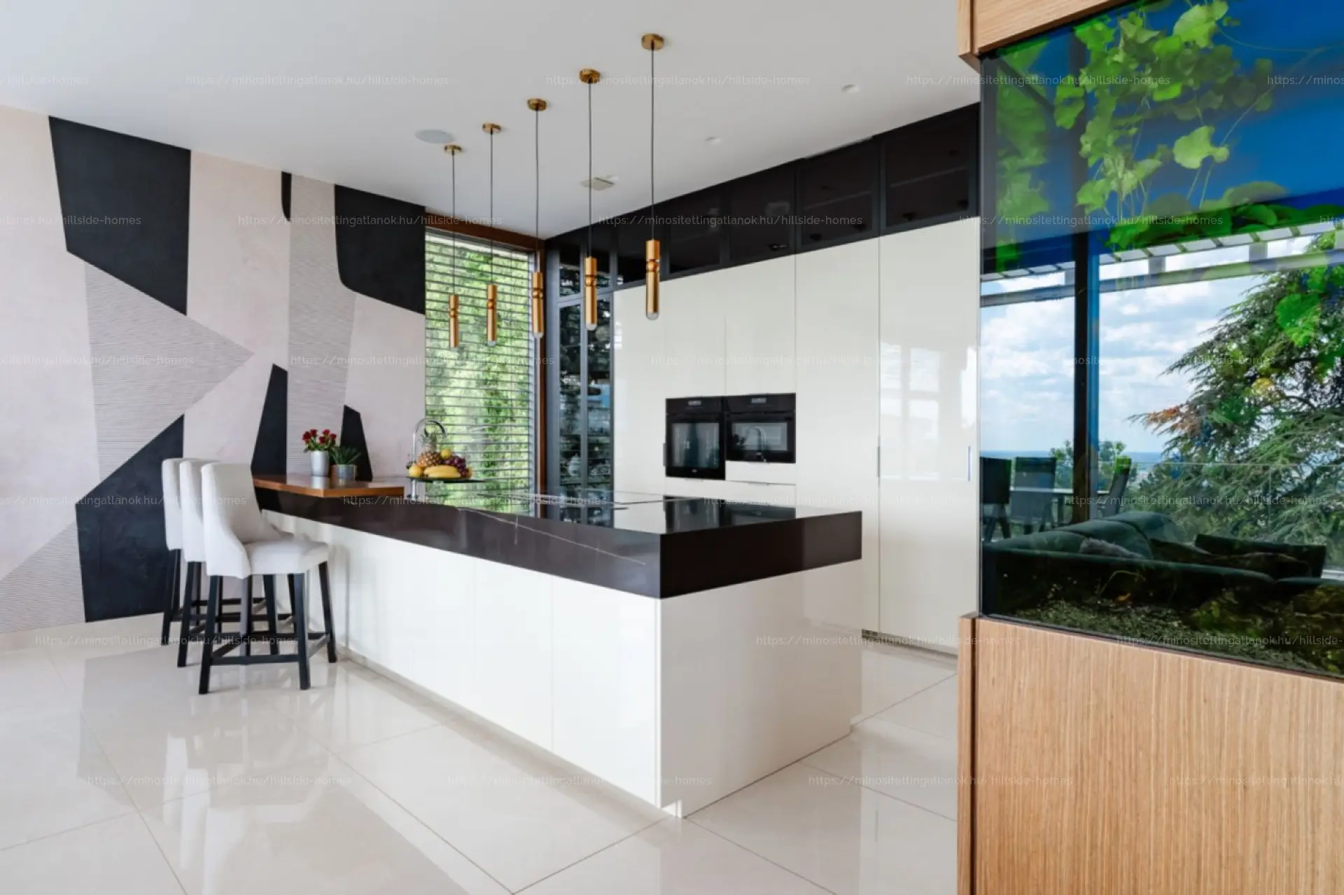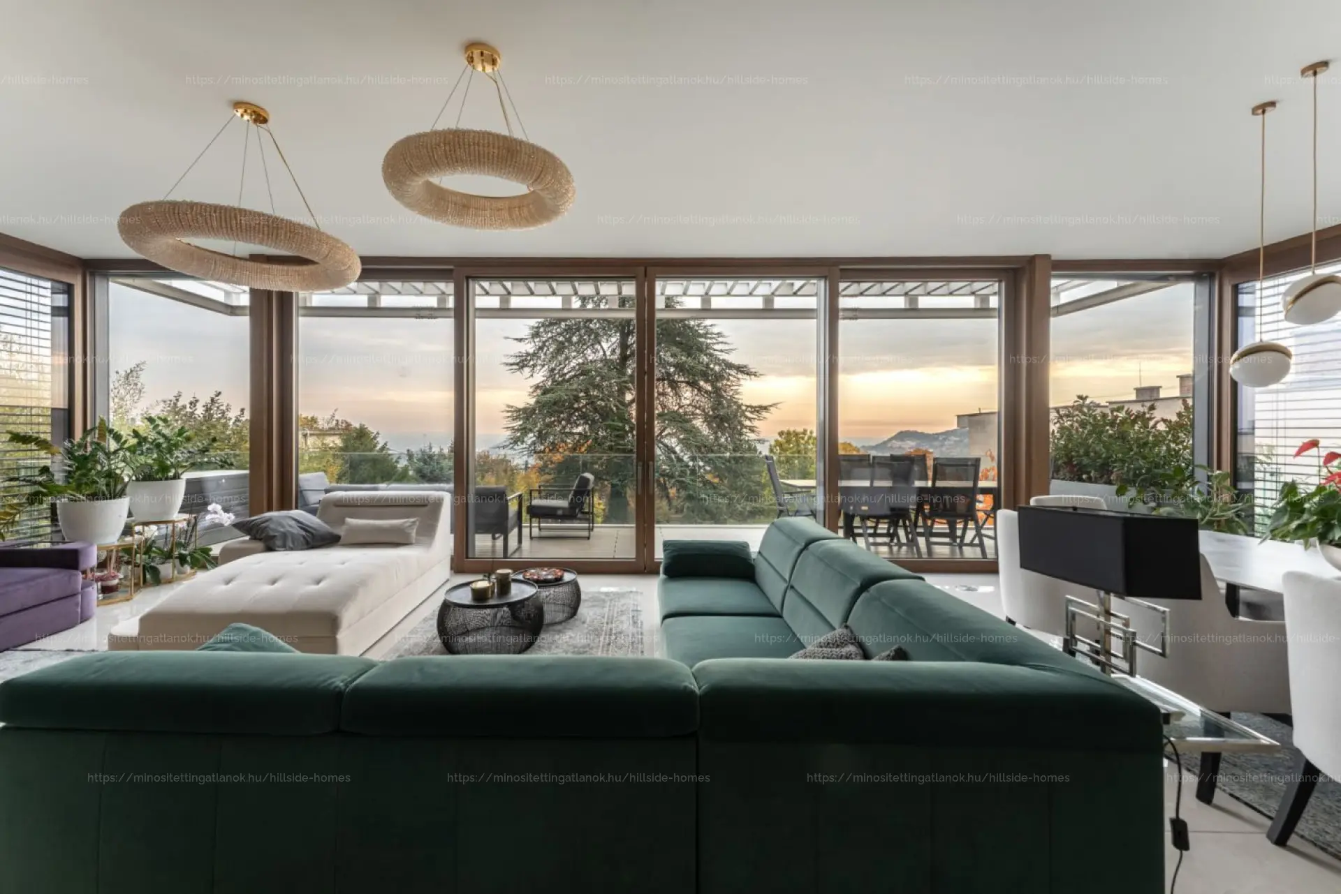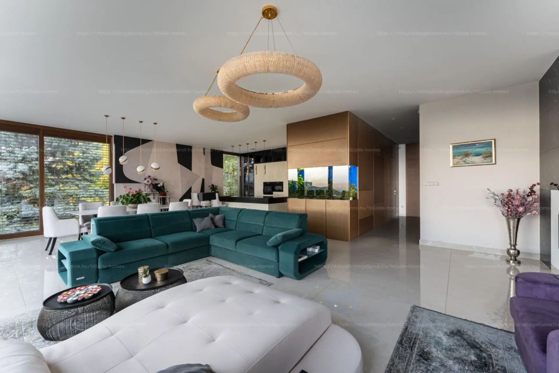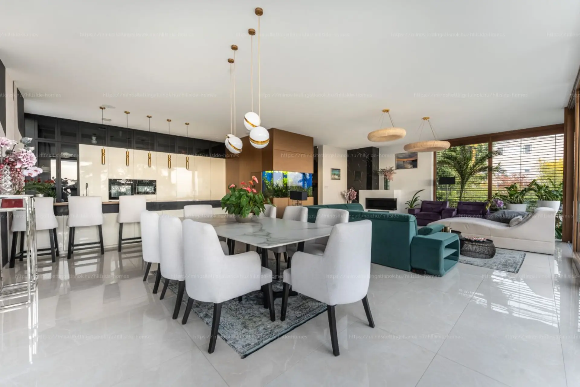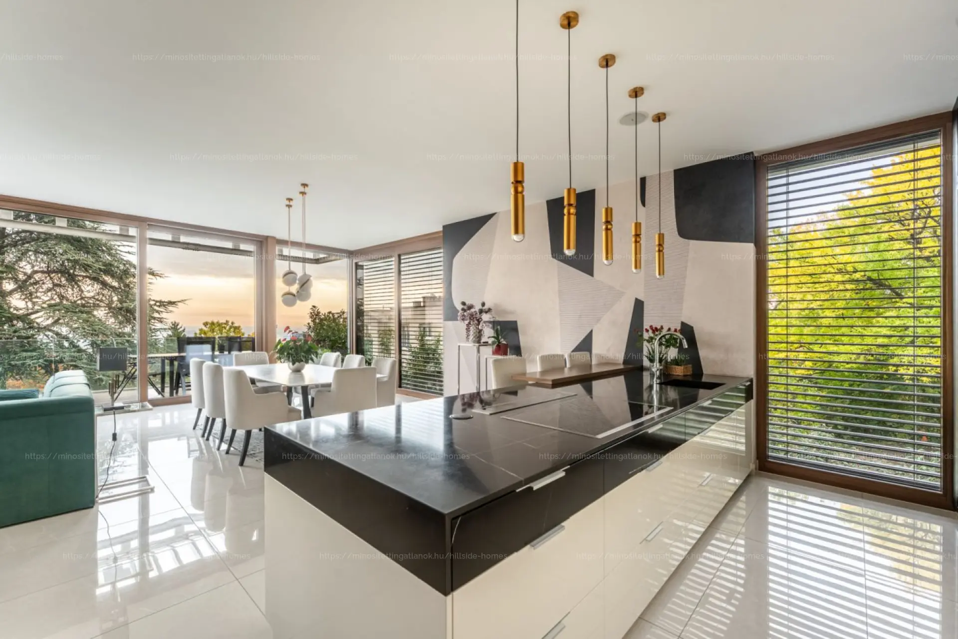 A 1249 m²-es telken elhelyezkedő épület minden részlete a prémium életminőséget szolgálja. A középső szint 3 méteres belmagassága, a hatalmas üvegfelületek és a fa–alu eukaliptusz nyílászárók (30 év garanciával) világos, levegős tereket teremtenek. A nappali amerikai konyhával, étkezővel és rejtett kamrával kapcsolódik a teraszhoz, amely közvetlen kertkapcsolatot biztosít.