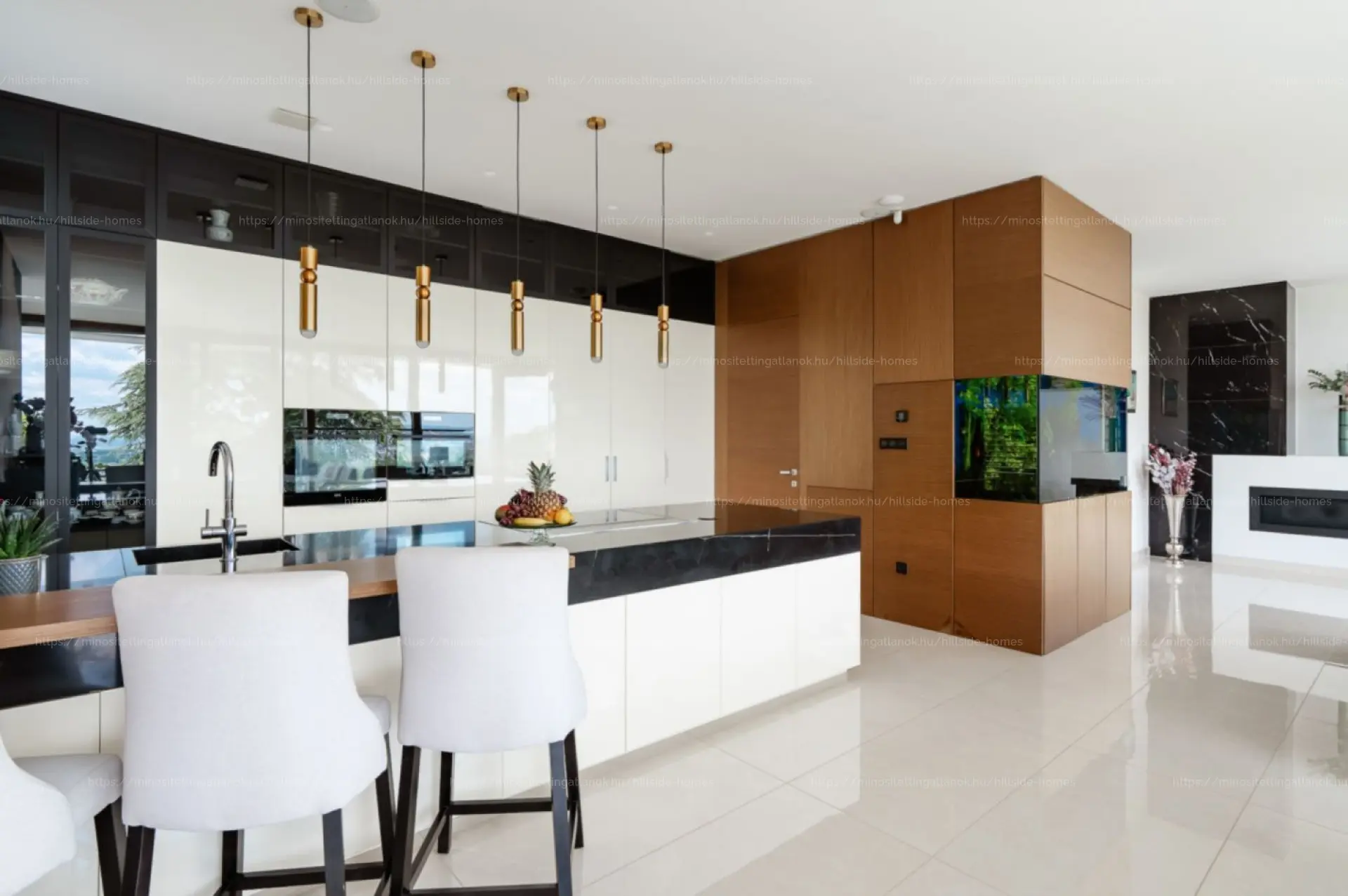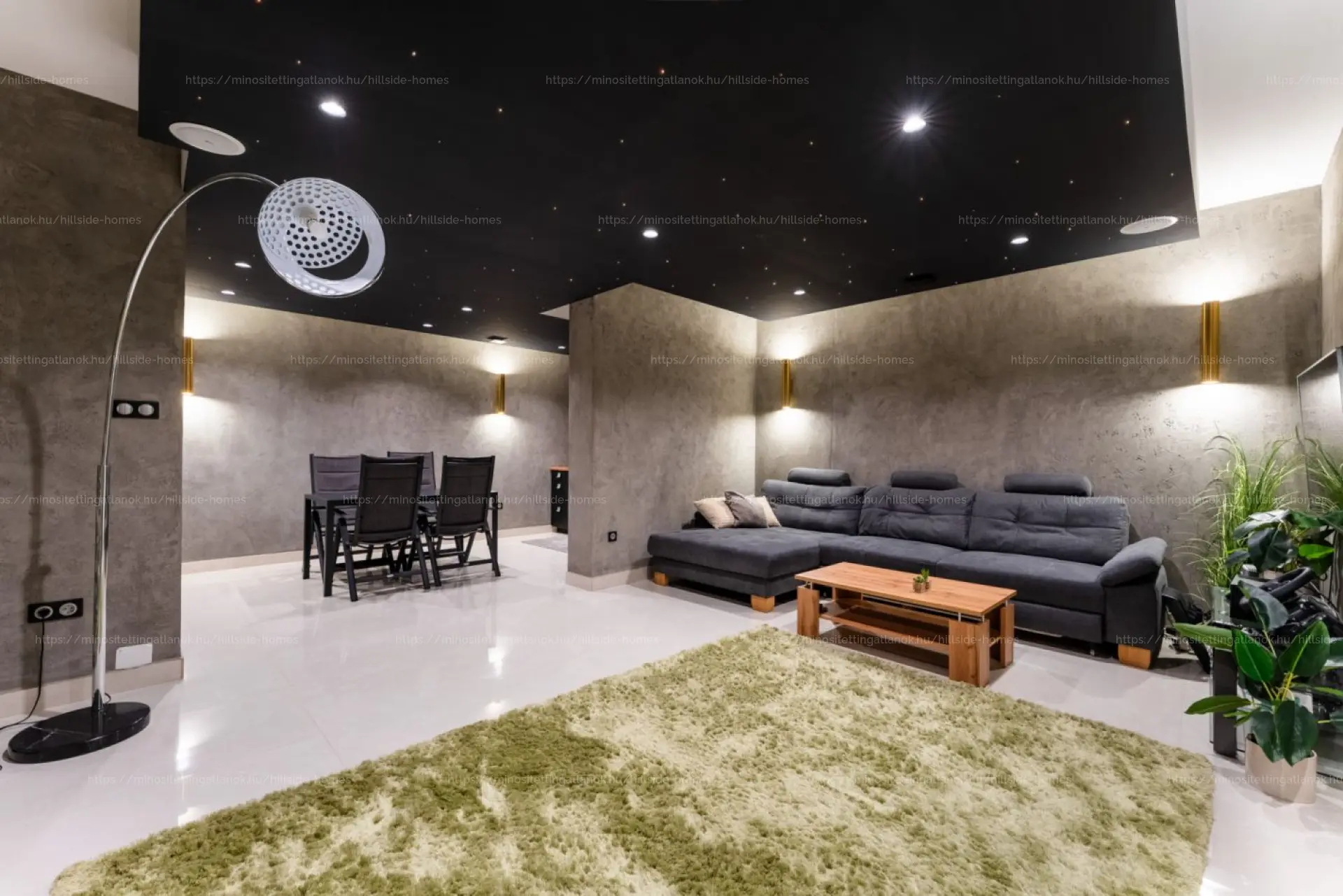 A belső terekben a Perlato Royal mészkő, a nagyméretű 150×300-as kerámia homlokzatburkolatok, az amerikai dió falpanelek és a lebegő lépcső teremtenek időtálló eleganciát. A ház teljes bútorzattal kerül átadásra.