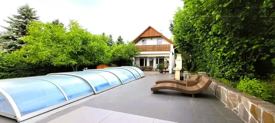 -az udvarban a 8x3 méteres fűthető és fedhető medence szinte minden évszakban kellemes kikapcsolódást nyújt