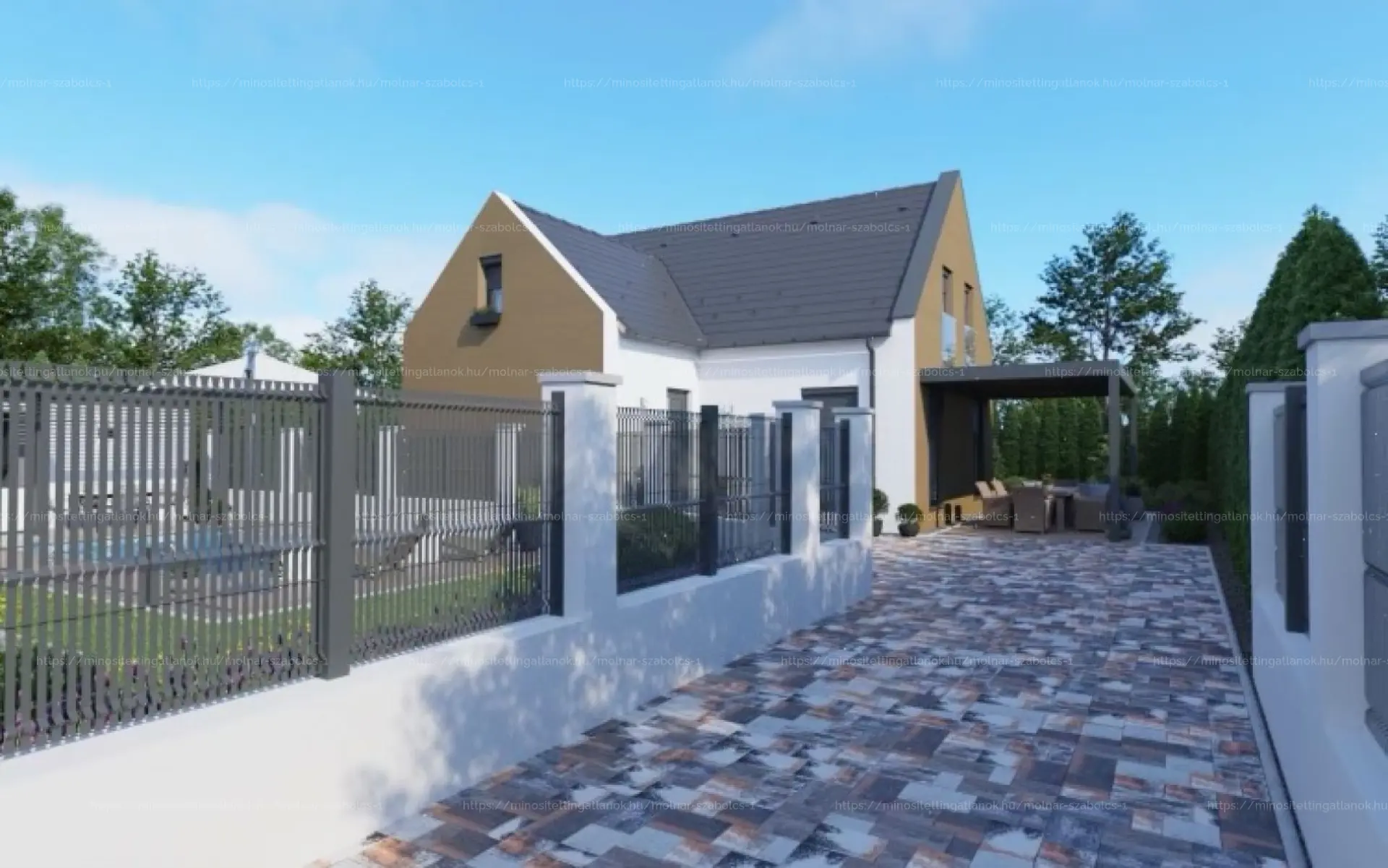 -Hangulatos, tágas terasz, esztétikus viacolor burkolatú udvar és kocsibeálló