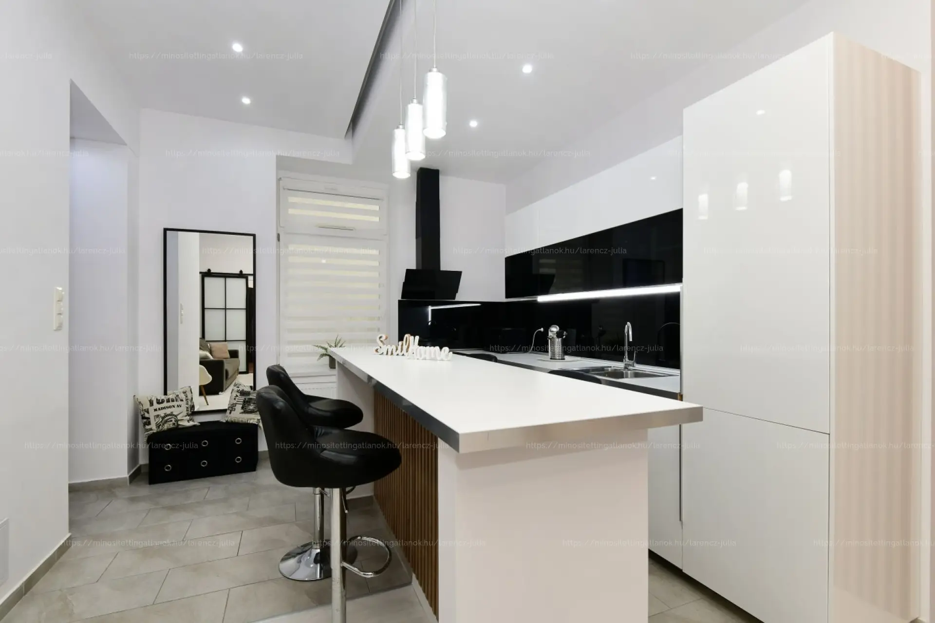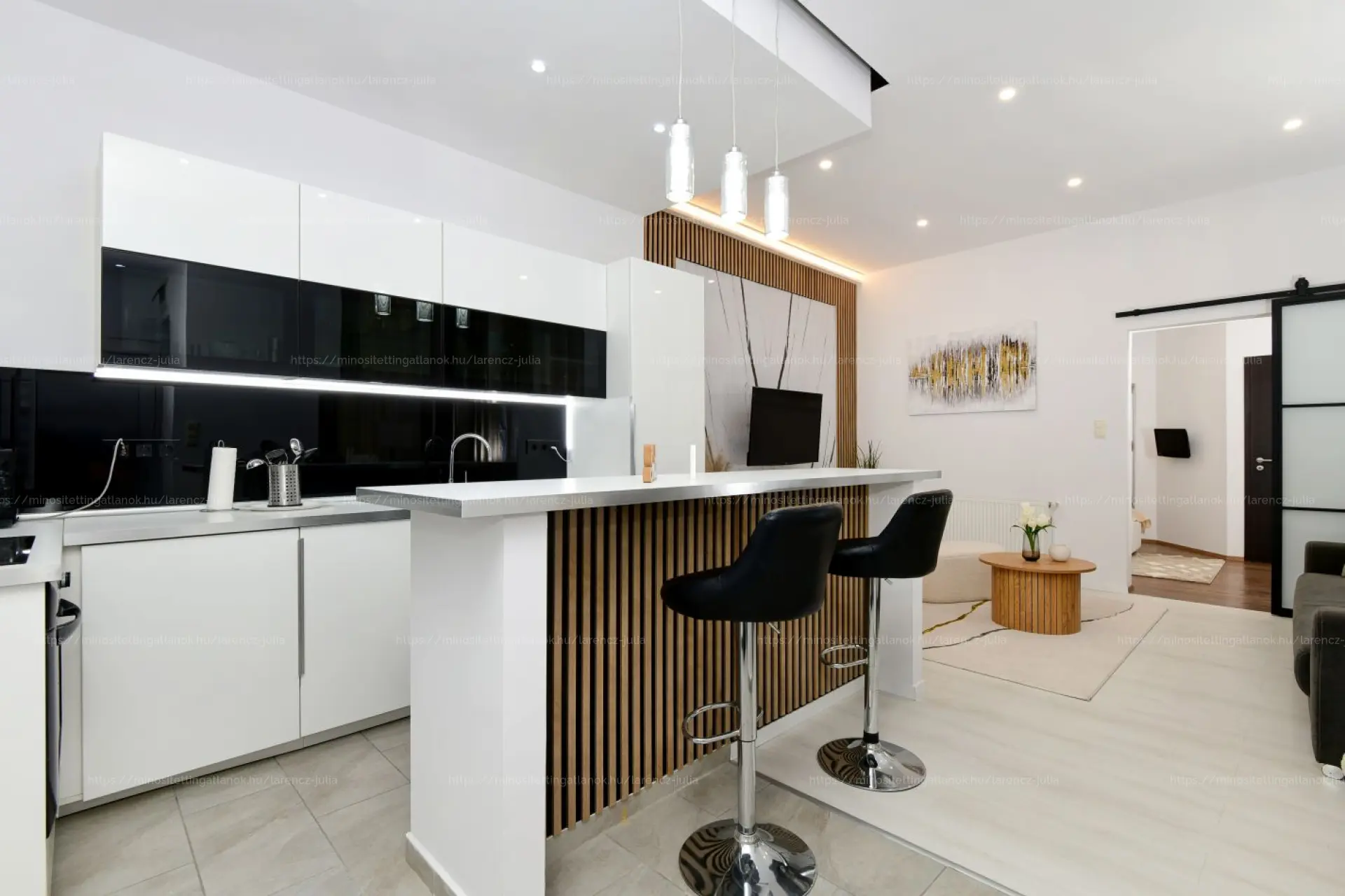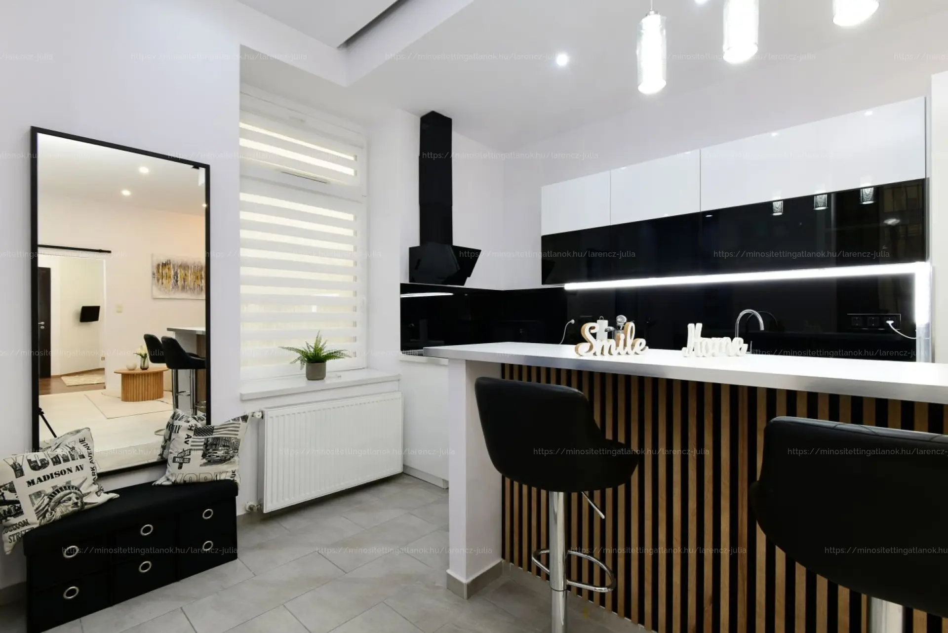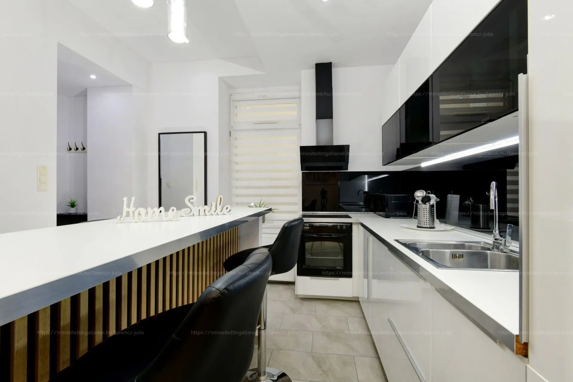 A vételár tartalmazza a teljes bútorzatot és gépesített konyhát (sütő, főzőlap, mikró, mosógép, mosogatógép, hűtő-fagyasztó).