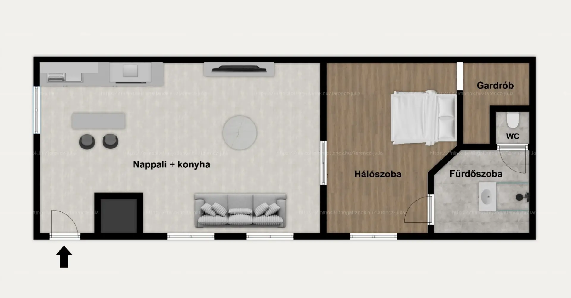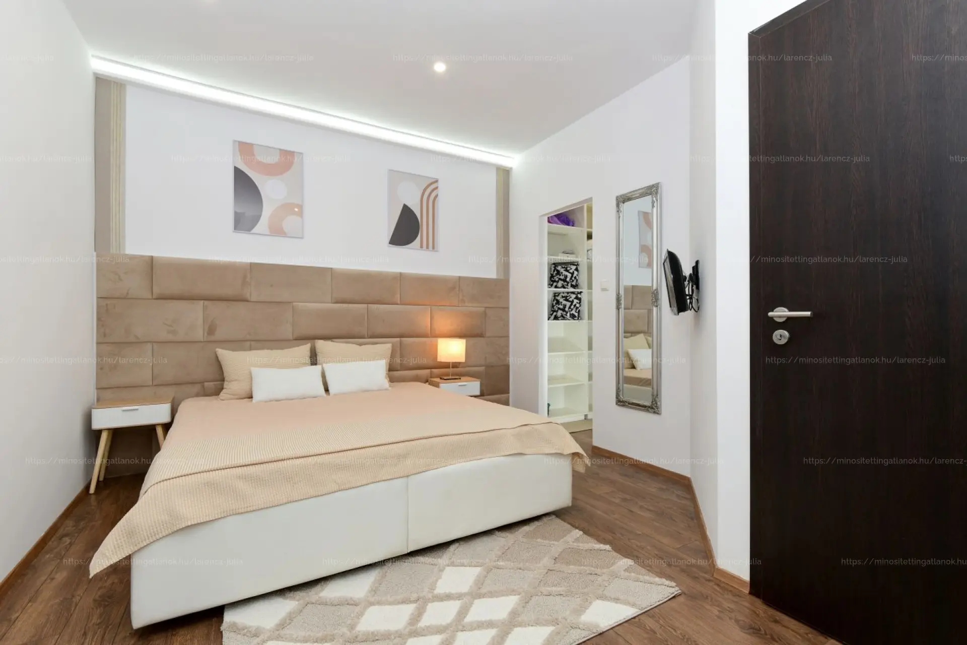 Amerikai konyhás nappali, tágas hálószoba gardróbbal, zuhanyzós fürdő, külön WC.