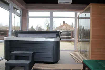 KÜLTÉRI adottságok: az udvarban 3 személyautó parkolása biztosított, a többi rész füvesített és egy külön FÚRT KÚTBÓL öntözhető. Szalonnasütő és grillező kialakításra került. WELLNESS részleg: 5 személyes jakuzzi és 3 személyes finn szauna áll a vendégek rendelkezésére.