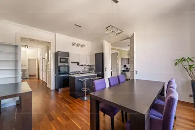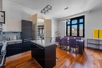 Eladó sorba került ez a felújított, 3. emeleti, 113 négyzetméteres, tágas, 3 szobás (nappali és 2 háló), gardróbos, tárolós, külön toalettes, napfényes lakás a Bakáts tér sarkánál egy rendezett nagypolgári épület legfelső emeletén.
