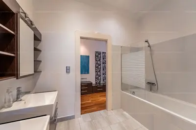 Szemben a tároló, a toalett és a tágas, kádas fürdőszoba nyílik.