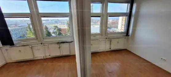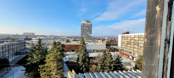 Központi, 5. emeleti, 62,00 m2-es iroda három helyiséggel, DÉLNYUGATI fekvésű, VILÁGOS, NAPFÉNYES terek és GYÖNYÖRŰ PANORÁMA a városra és a Bakony hegyeire. Az épület a 70-es évek elején épült, folyamatosan karbantartott.