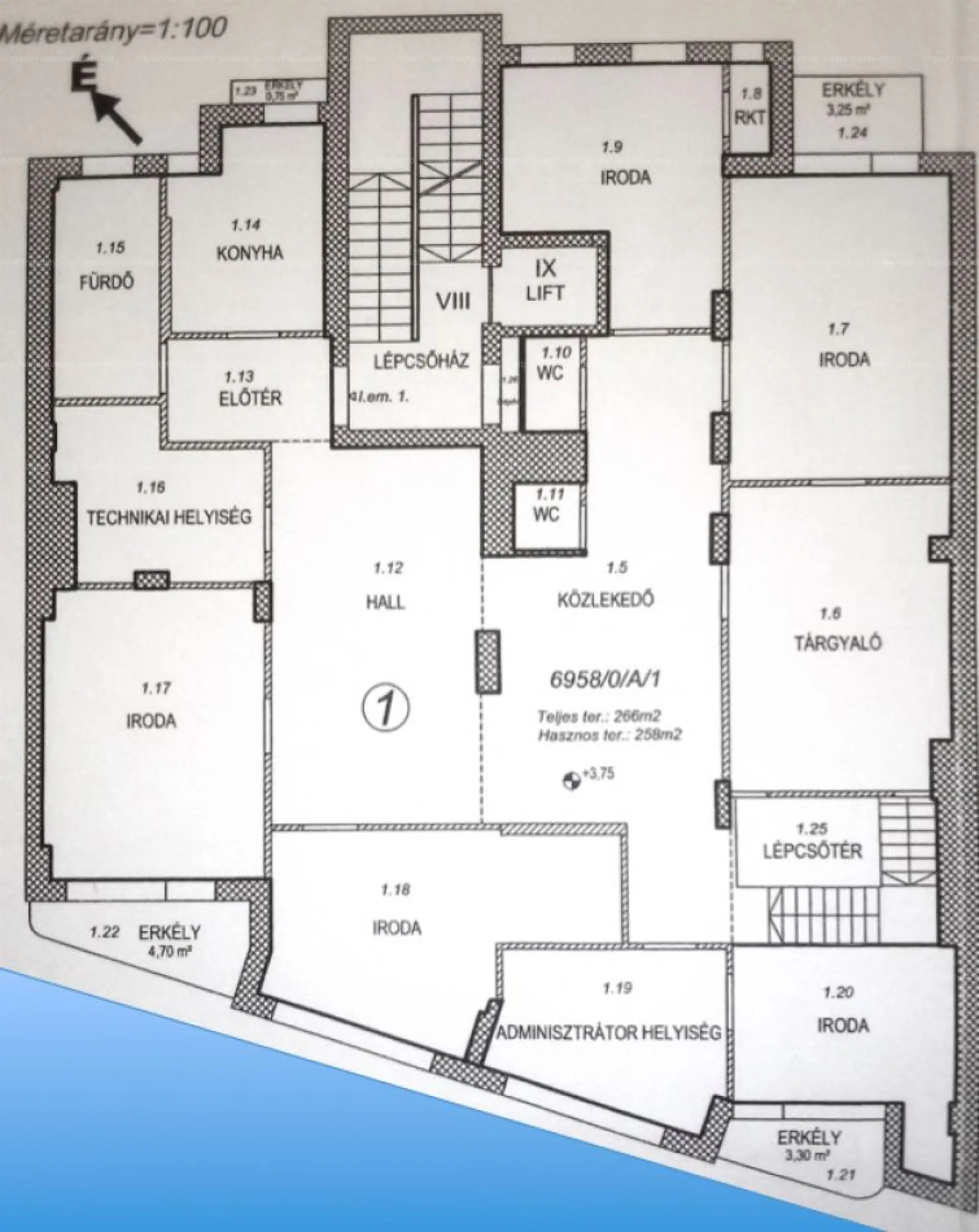 Az ingatlankomplexum a tulajdoni lapon 258 nm, az alapító okirat szerint 270 négyzetméter, a különbség a 4 erkélyből adódik.