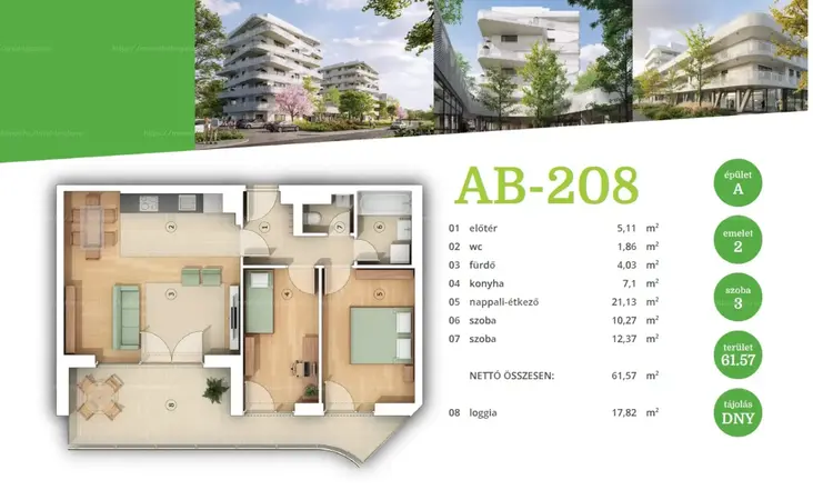 61,57 nm alapterület, 17,82 nm terasz, délnyugati tájolás — a nap minden órájában élvezhető fény és kényelem.