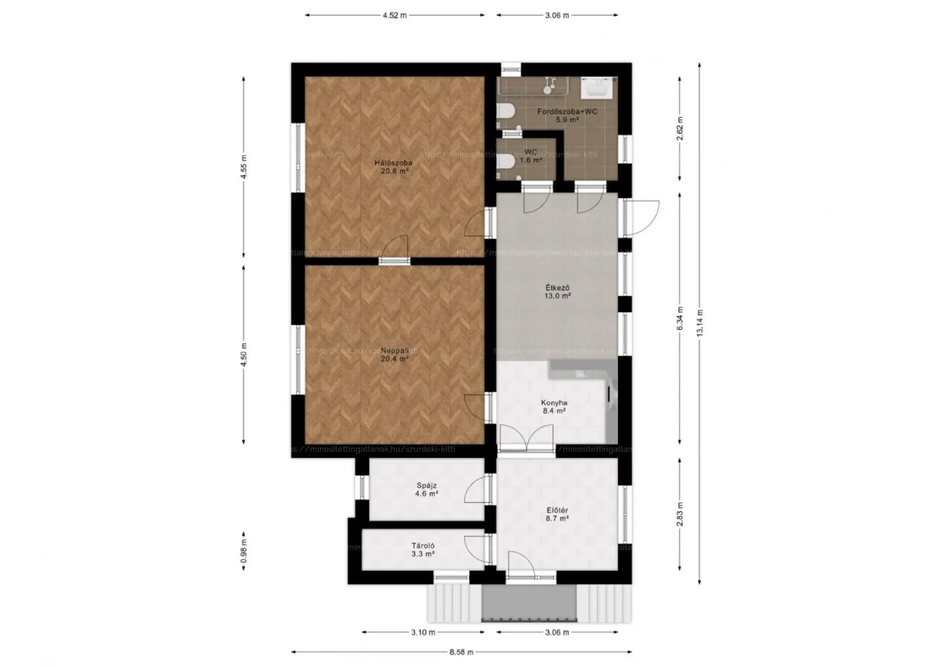 🏡 Főépület: 86,5 m² – 2 szoba, étkezős konyha, tárolók, fürdő, WC, előtér, 2 bejárat