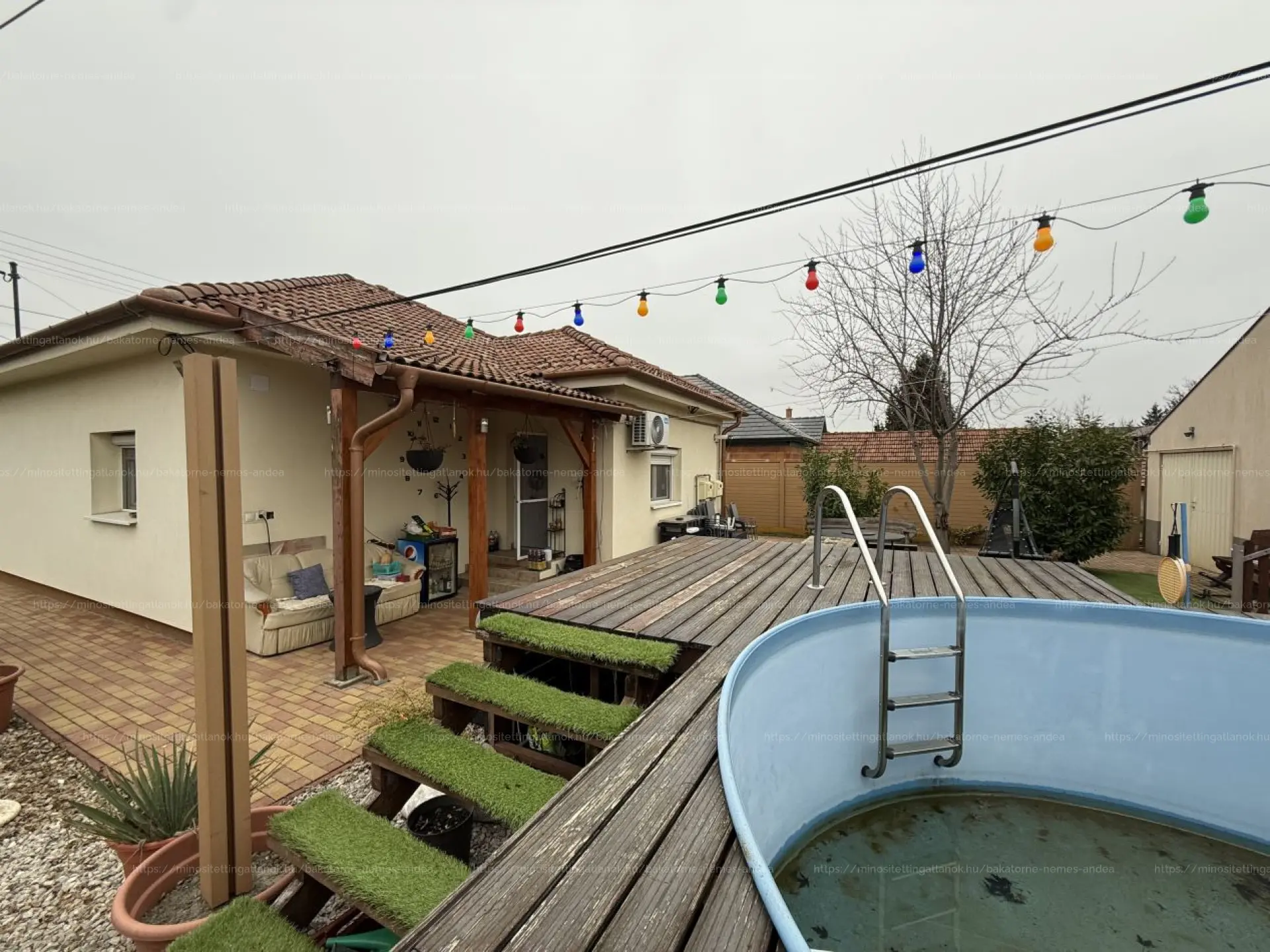A bejutást a telekre elektromos kapu biztosítja, több autó tud a térkövezett részen parkolni, a telken található még egy hatalmas medence, valamint egy 3 részes tároló a kerti szerszámok tárolására.