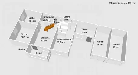 A földszint 2 szoba, fürdőszoba, külön mellékhelyiség, előszoba, konyha-étkező, kamra, tároló elrendezésű, a nagyméretű étkezőből kijárat nyílik a 20 nm-es fedett teraszra.