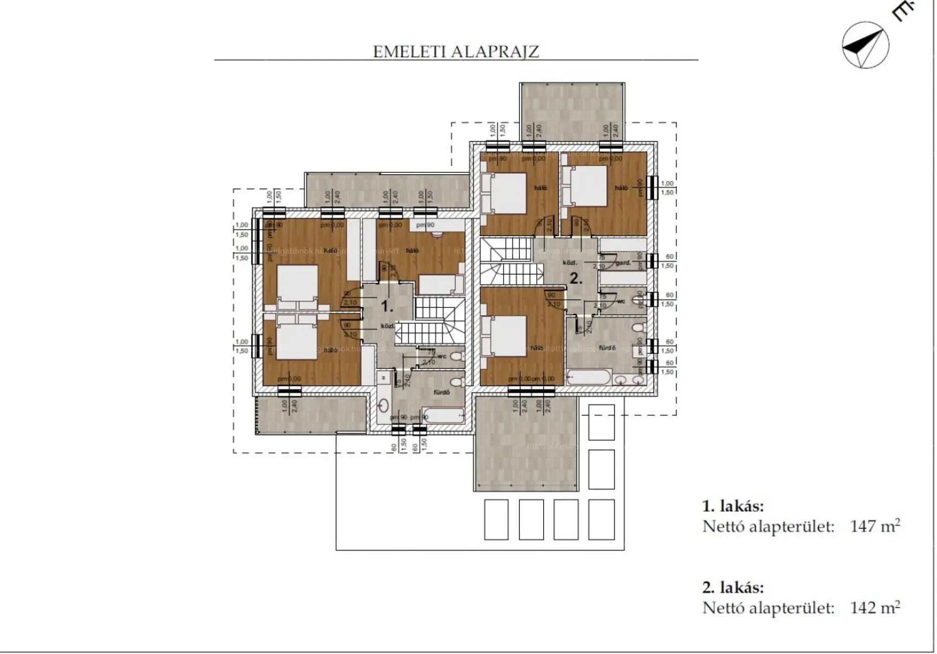 • Emelet: 3 hálószoba, fürdőszoba WC-vel, külön illemhelyiség