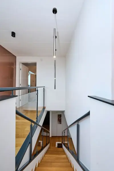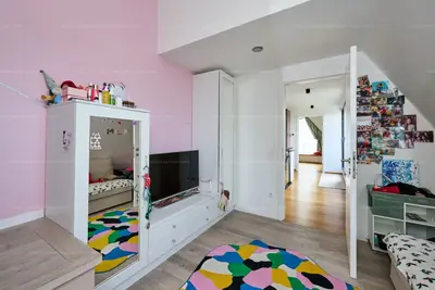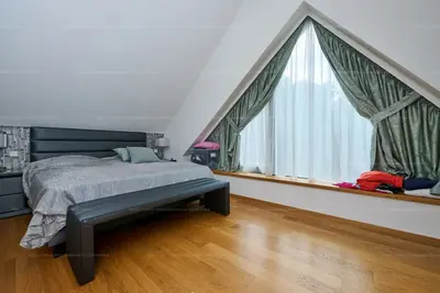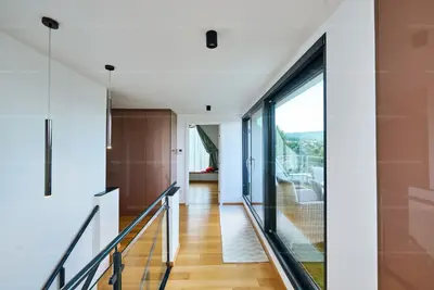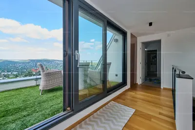 Emelet: A nappaliból induló elegáns lépcső vezet fel a hálószobákhoz. Itt található egy nagy hálószoba és két kisebb szoba, mindegyik külön illemhelyiséggel és beépített szekrényekkel. Az emeletről egy újabb terasz nyílik, ahonnan a Budai-hegyek látványa tárul elénk.