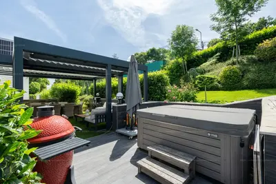 Földszint: Belépve tágas előtér fogadja, amelyből közvetlenül a MIELE gépekkel felszerelt, modern konyhába érkezünk. A nappali és étkező elegáns, egyedi design bútorokkal berendezett, igazi családi élettér. Innen nyílik a lakás egyik legkülönlegesebb része: a 39 m²-es, fűthető terasz, amely nyitható-zárható pergolával, jacuzzival teszi teljessé a mindennapokat. A teraszhoz kapcsolódik a 568 m²-es kizárólagos használatú kert, automata öntözőrendszerrel és saját kertésszel.