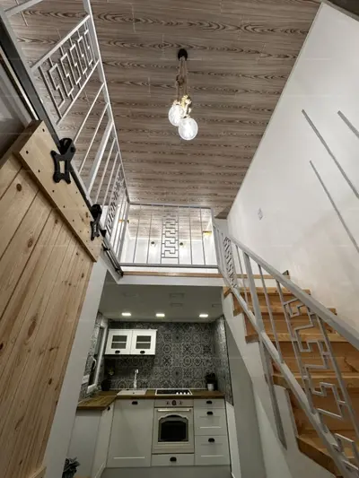 This 21 sqm net living area flat is enhanced by a 10 sqm mezzanine with 1,75 m height, making it a perfect spot for a sleeping area, providing a good segregation of the living space.