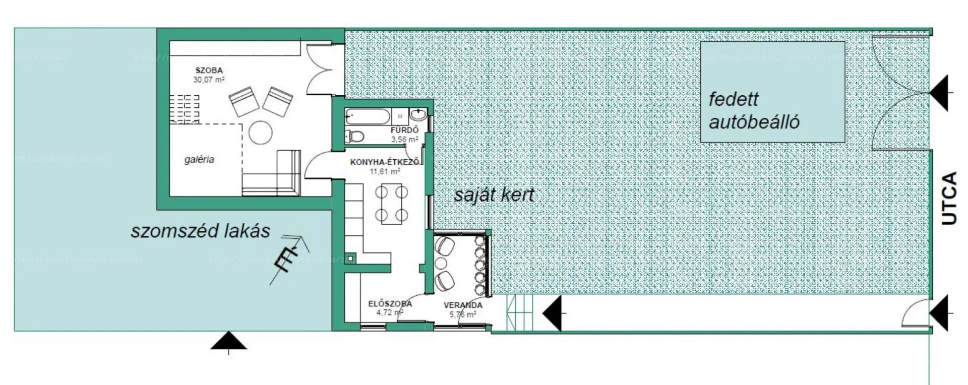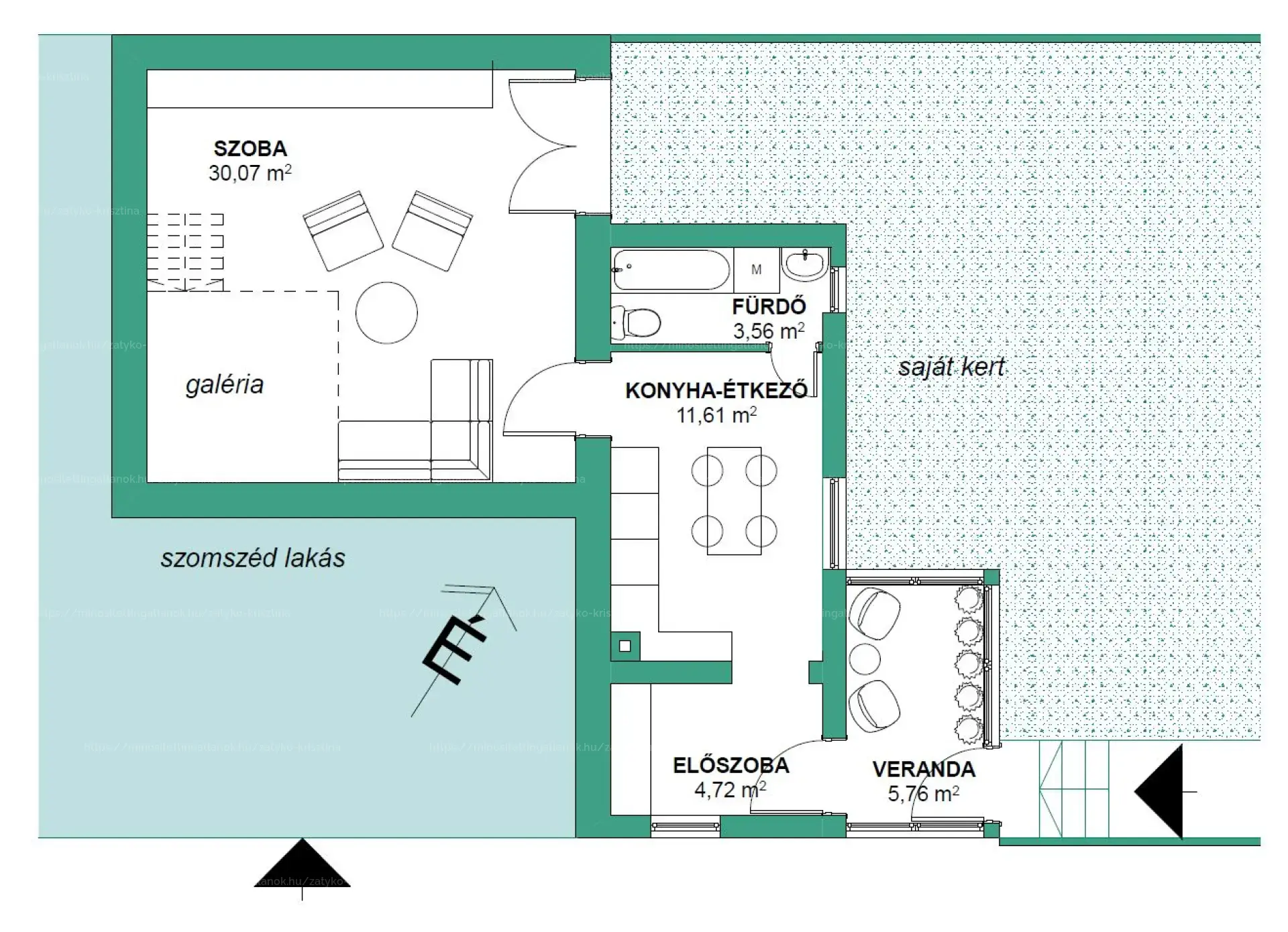 A kert felől érjük el a bejárati verandát, majd az előszobát. A lakásba belépve megtalálható egy jól felszerelt konyha-étkező, egy fürdőszoba, valamint egy nagy méretű, nagy belmagasságú, alvó galériával rendelkező szoba. Innen egy terasz ajtón keresztül a kertbe juthatunk. A fűtést gáz cirko kazán nyújtja, radiátorok segítségével. A falazat kő és tégla. A külső nyílászárók két rétegű hőszigetelt üvegezésű műanyag szerkezetű ablakok. Az ingatlan jó állapotú, költözhető. Ha szükséges, a tetőtér beépíthető.
