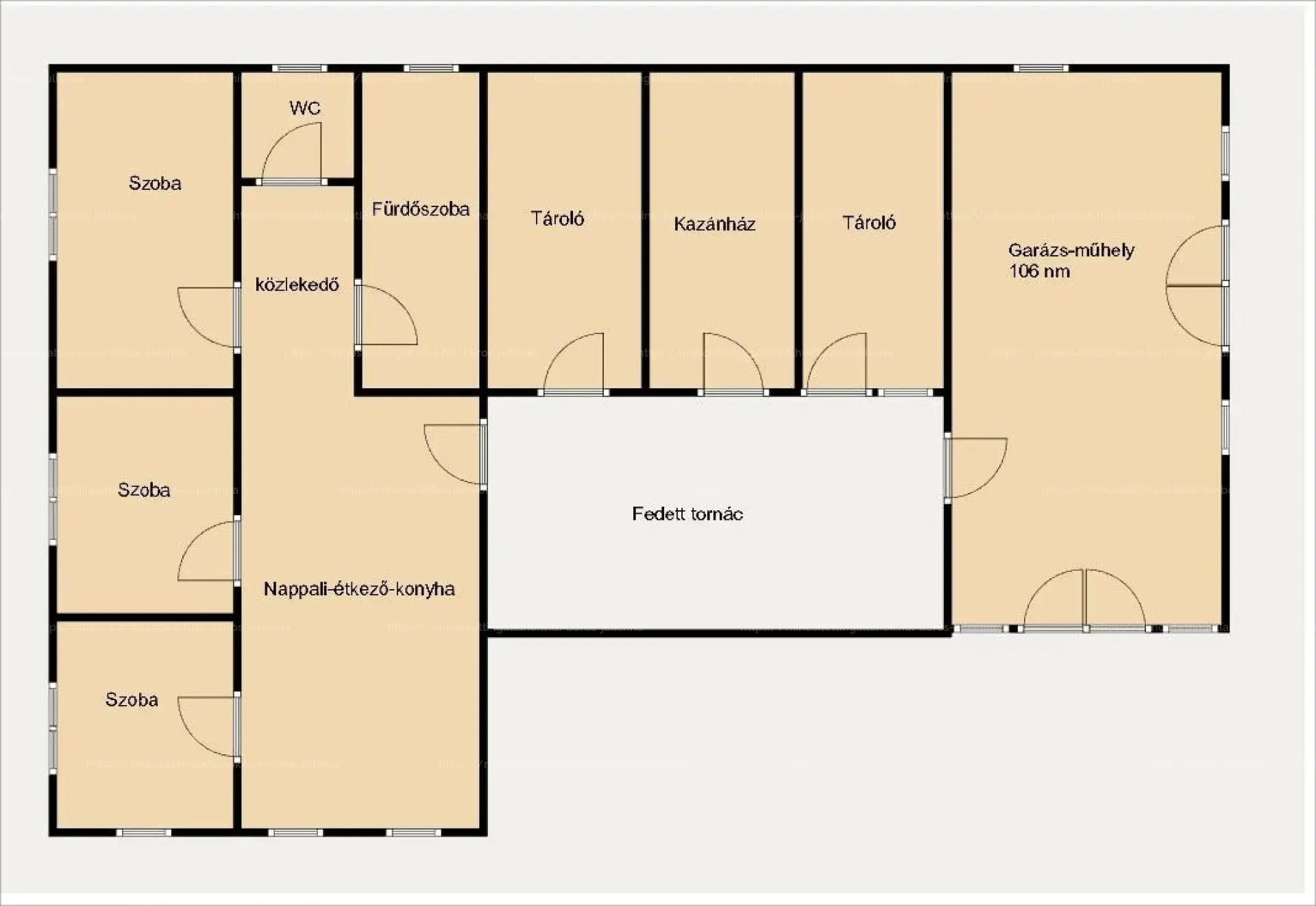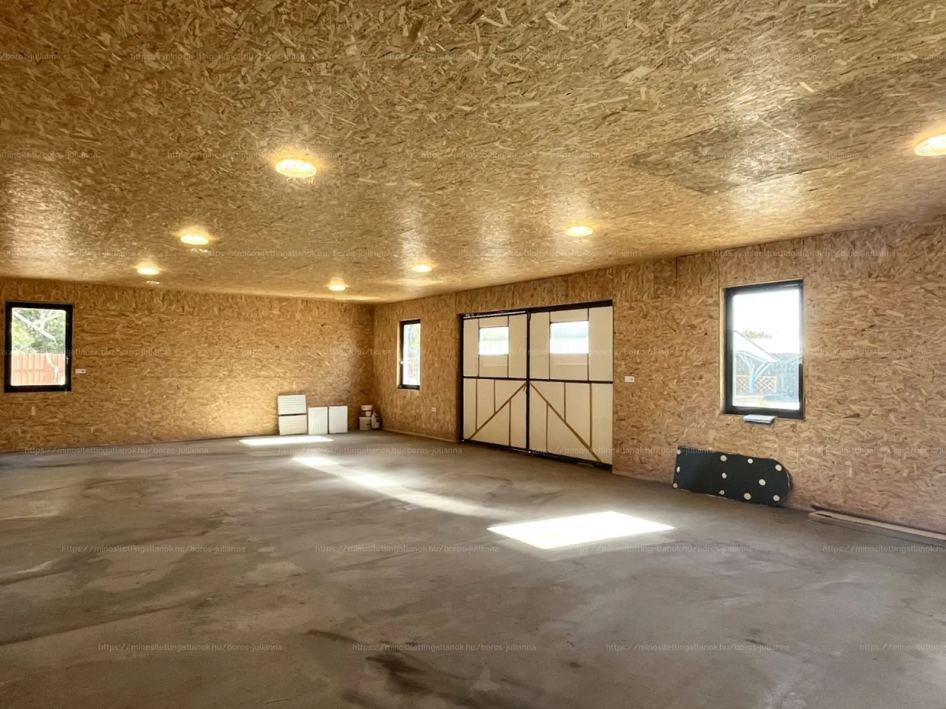 A házhoz 106 m²-es, fűthető garázs, 50 m²-es fedett tornác, valamint a kert végében szaletli tartozik.