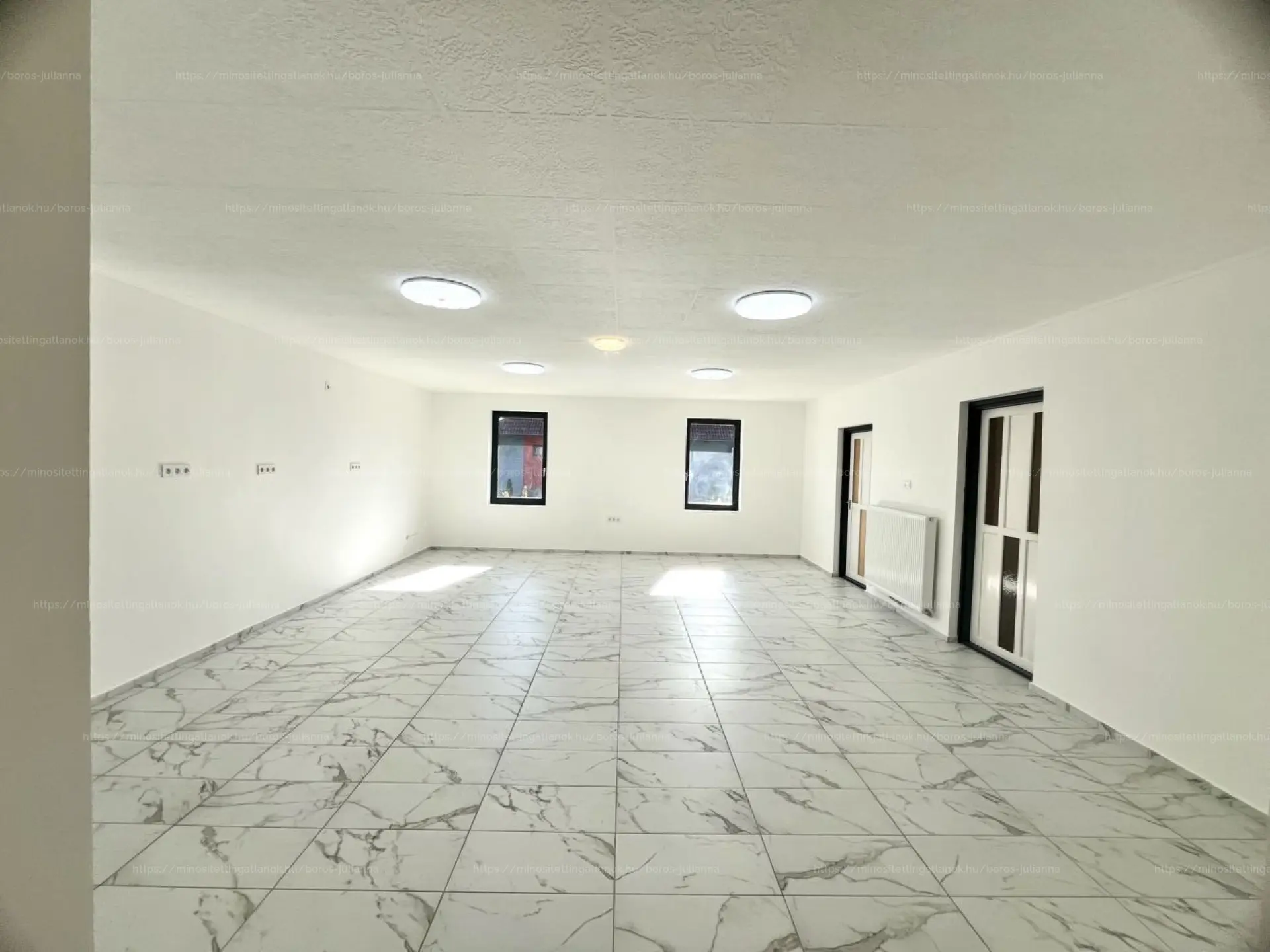 A 47,5 m²-es nappali–étkező–konyha tágas, világos központi élettérként szolgál. A konyha berendezése az új tulajdonosra vár, azonban minden szükséges kiállás előkészítve található.