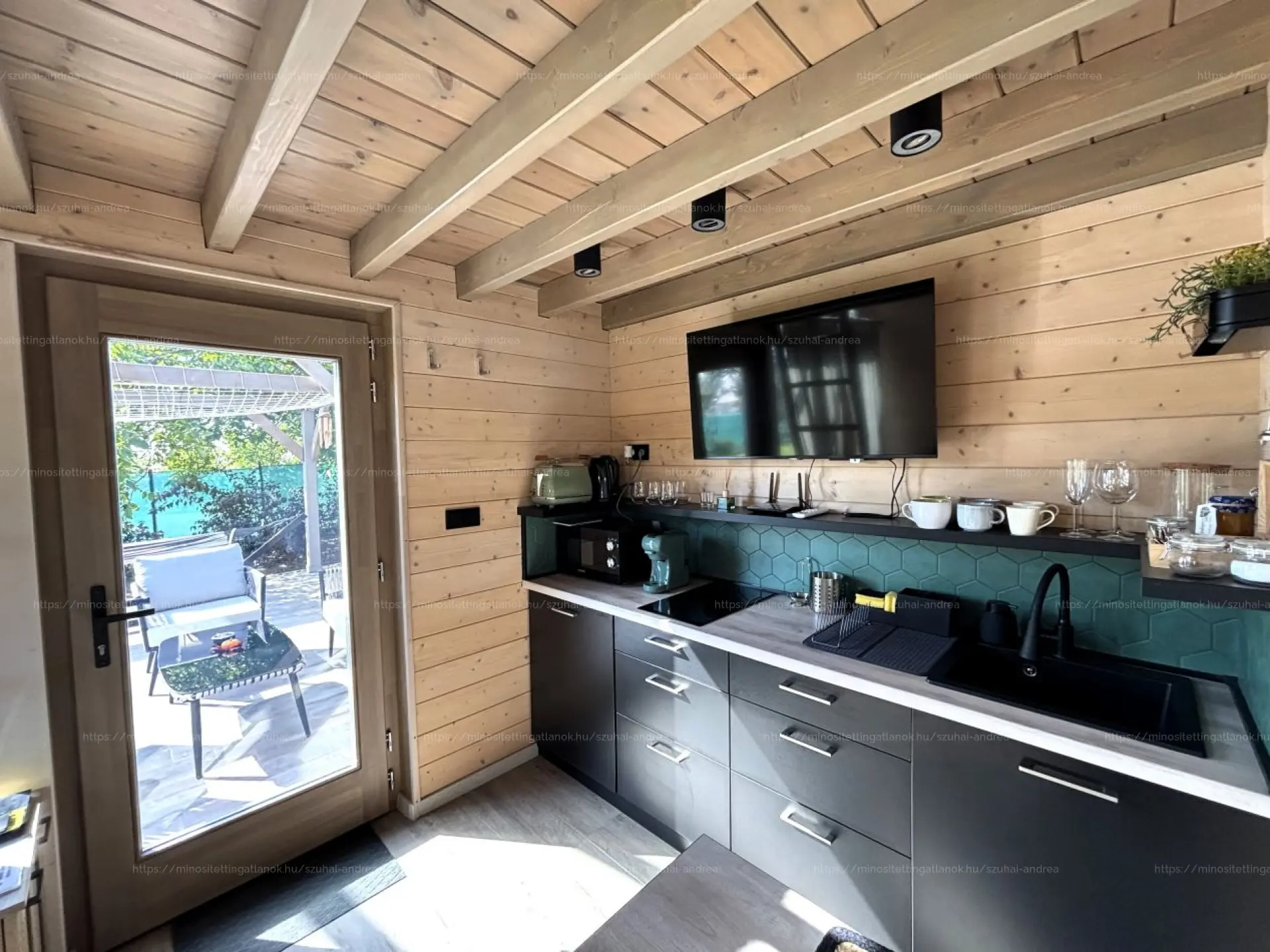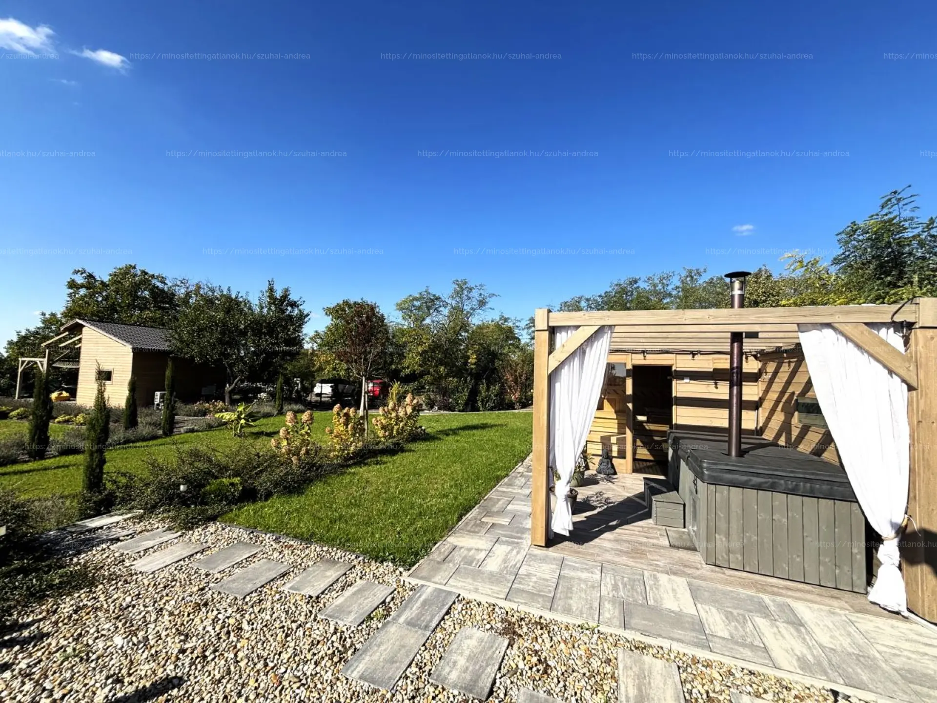 - KÜLÖNÁLLÓ WELLNESS ÉPÜLET szaunával, dézsával, kinti zuhanyzóval, FEDDETT PIHENŐRÉSSZEL és hangulatos esti világítással.