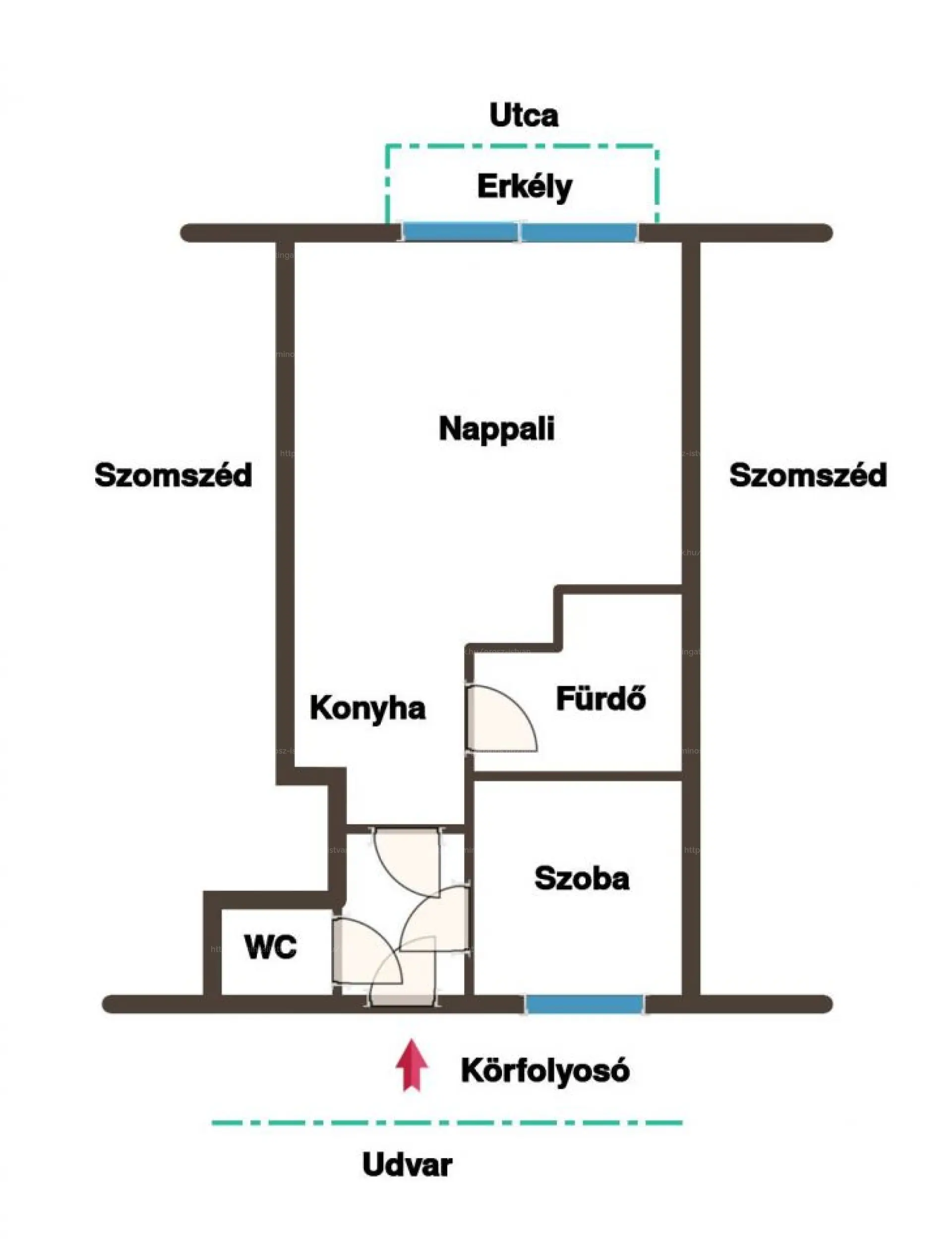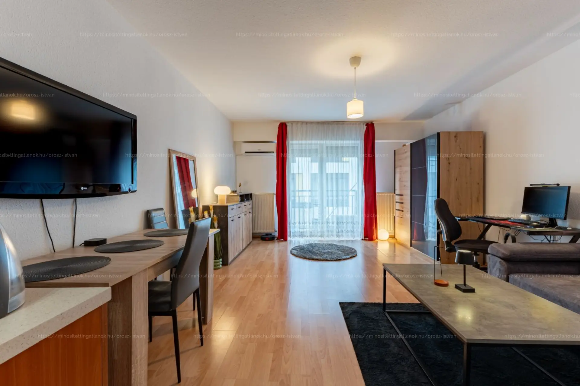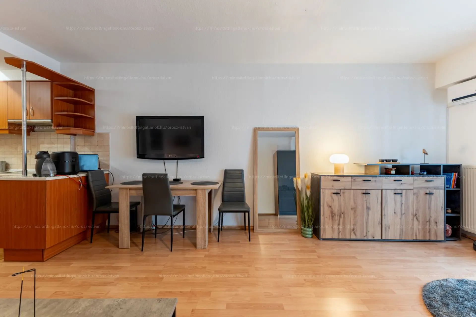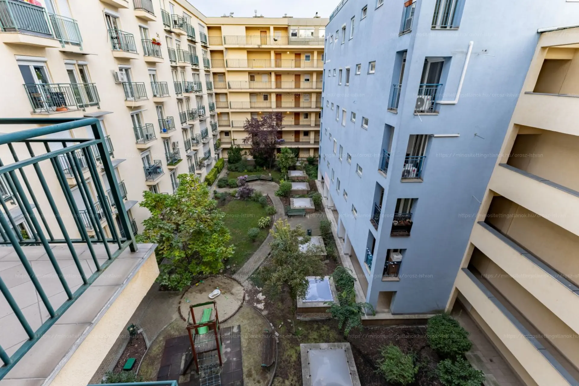 Eladó Budapest 8. kerületében, a Rákóczi térhez közel, a József körúttal párhuzamos zsákutcában, 2008 körül épült ház 5. emeletén, egy 43 négyzetméteres, 1+1 félszobás, erkélyes lakás.Az épület 2006 és 2008 között épült, háromszintes mélygarázzsal és hét emeletes szintkiosztással.Az épülettömb több része két belső udvart határol, az egyik udvart parkosították és játszótér került kialakításra. Az épületben négy lift üzemel, ami biztosítja a kényelmes közlekedést. A ház rendszeresen karbantartott, így a műszaki és esztétikai állapota átlagos, korának megfelelő. Belépés után fedett átjárón érhető el a lift, ami az emeleti körfolyosóra nyílik. Innen közelíthető meg a lakás. A bejárati ajtó többpontos záródású biztonsági ajtó, az ablakok hőszigetelő üveggel és redőnnyel szerelt műanyag nyílászárók. A 43 nm alapterületű lakásban egy belső udvarra néző hálószoba található, továbbá külön WC fűtéssel és kézmosóval, és kádas fürdőszoba tartozik hozzá. Az előszoba az amerikai konyhás nappaliba vezet, onnan az utcai nézetű, nyugati tájolású erkélyre léphetünk ki. A szobák burkolata laminált parketta, a többi helyiség kerámialappal burkolt. 2025 ben tisztasági festés történt, ennek köszönhetően a lakás tiszta és rendezett állapotban várja új tulajdonosát. A fűtést és a melegvíz ellátást kombi cirkó megoldja, a helyiségekben lapradiátorok vannak, a fürdőben törölközőszárítós radiátor és páraelszívó növeli a komfortot. A fűtés átalánydíja 8000 Ft havonta, a közös költség 15000 Ft havonta. A környék infrastrukturális ellátottsága kiváló, a Rákóczi téren elérhető a négyes metró, a Blaha Lujza tér a piros metróval kb öt perc sétára van, a környéken a négyes és a hatos villamos megállói is könnyen megközelíthetőek. A kerület rendezési terveinek megfelelően a Rákóczi tér és a Csarnok negyed felújítása már lezajlott, így a környék rendezett és folyamatosan fejlődik. Mivel az utca zsákutca, nincs zavaró átmenő forgalom, ami csendesebb, nyugodtabb környezetet biztosít. A parkolás megoldható az épület alatti mélygarázsban, van lehetőség bérlésre és vásárlásra is, a kerületi lakosoknak az önkormányzattól parkolókártya igényelhető amellyel az utcán ingyenes a parkolás. Teljes tulajdonban van 1/1 formában, várhatóan 2026 februárjától költözhető. Nézze meg és tegyen rá ajánlatot.