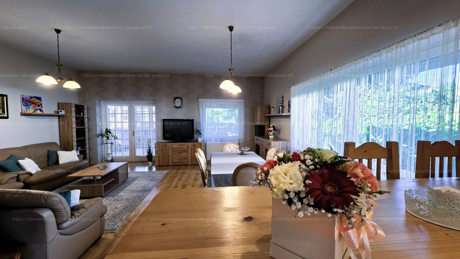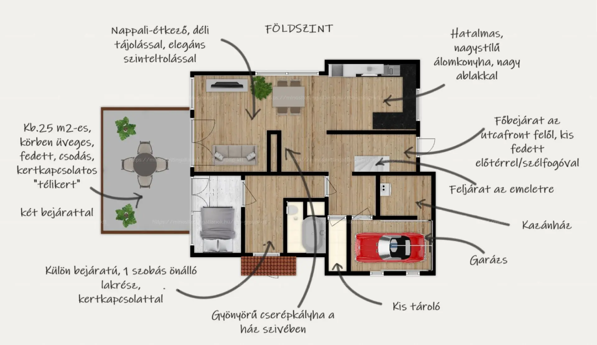 * Földszinten nappali kertkapcsolattal + konyha + télikert