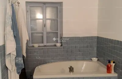 Fürdőszoba fürdőkáddal a földszinten, wc mosdóval a tetőtérben. Egy külön wc van a földszinten a hátsó kijárat mellett, ami a kertből egyszerűen megközelíthető. A WC-vel szemben található meg a mosógép, egy beugróban. A fűtésről egy kerámiabevonatú tömegkályha gondoskodik, amely naponta egy alkalommal befűtve folyamatosan tartja a hőmérsékletet, akár több napon át, így télen-nyáron élhető marad a ház. A házhoz tartozó erdő karbantartása jórészt biztosítja a tüzelőt. Az ingatlan modern csatornahálózattal ellátott.