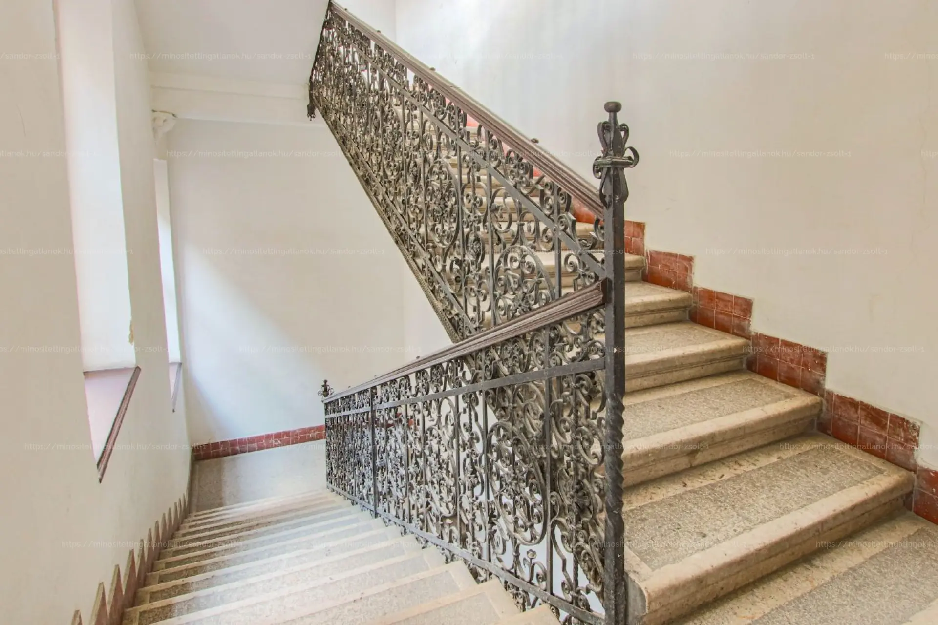 A lakás egy kis hangulatos kuckó, alaprajzából adódóan is rendkívül otthonos. A lakás felsőbb emelet révén nagyon világos, sok fény érkezik be. A belváros ellenére a lakás csendes, hiszen a belső udvarra néz. Állógalériával rendelkezik, melynek mérete kb. 6 négyzetméter, a belmagasság 380 cm. A fürdő és vécé külön helységben található.