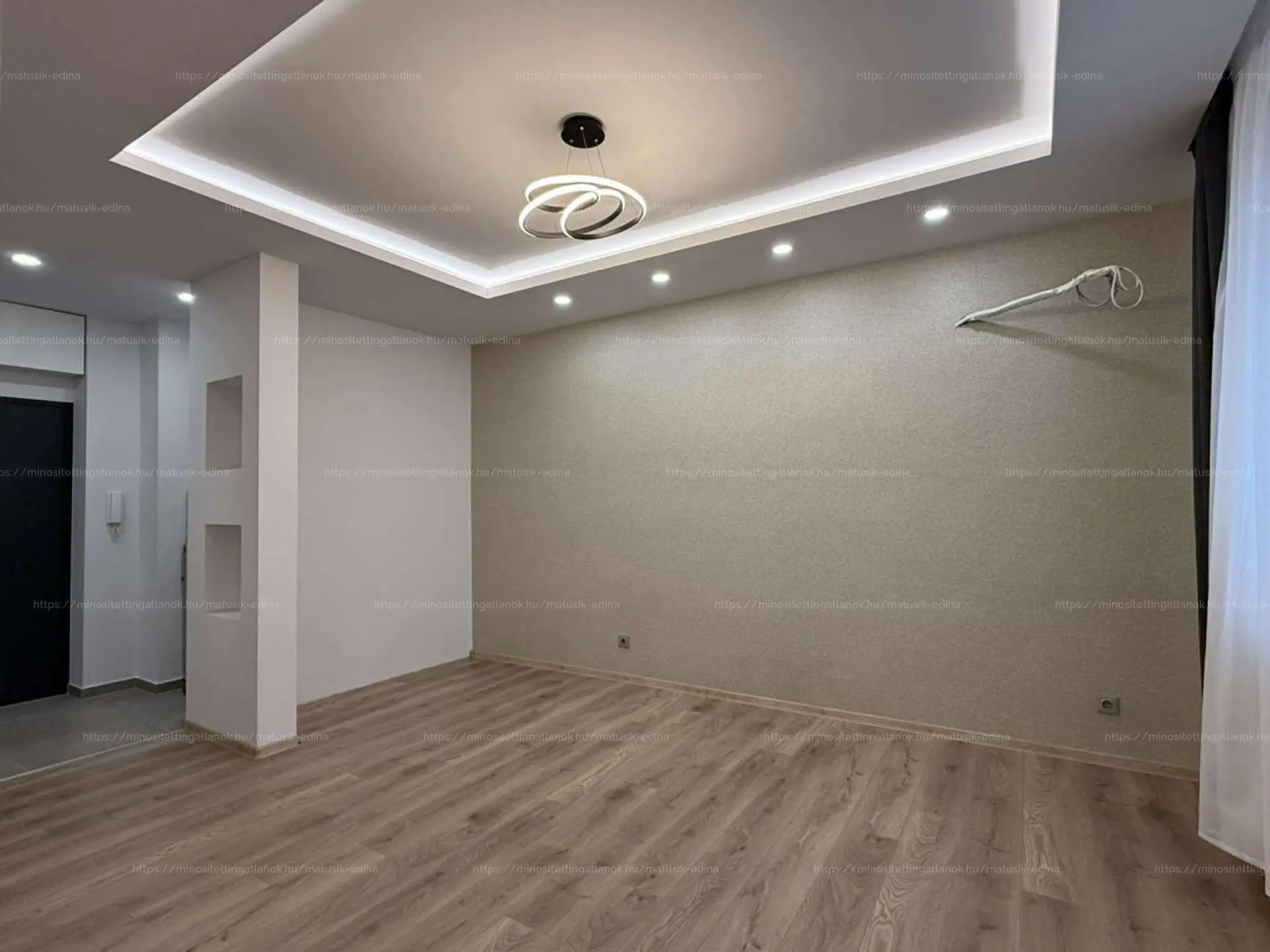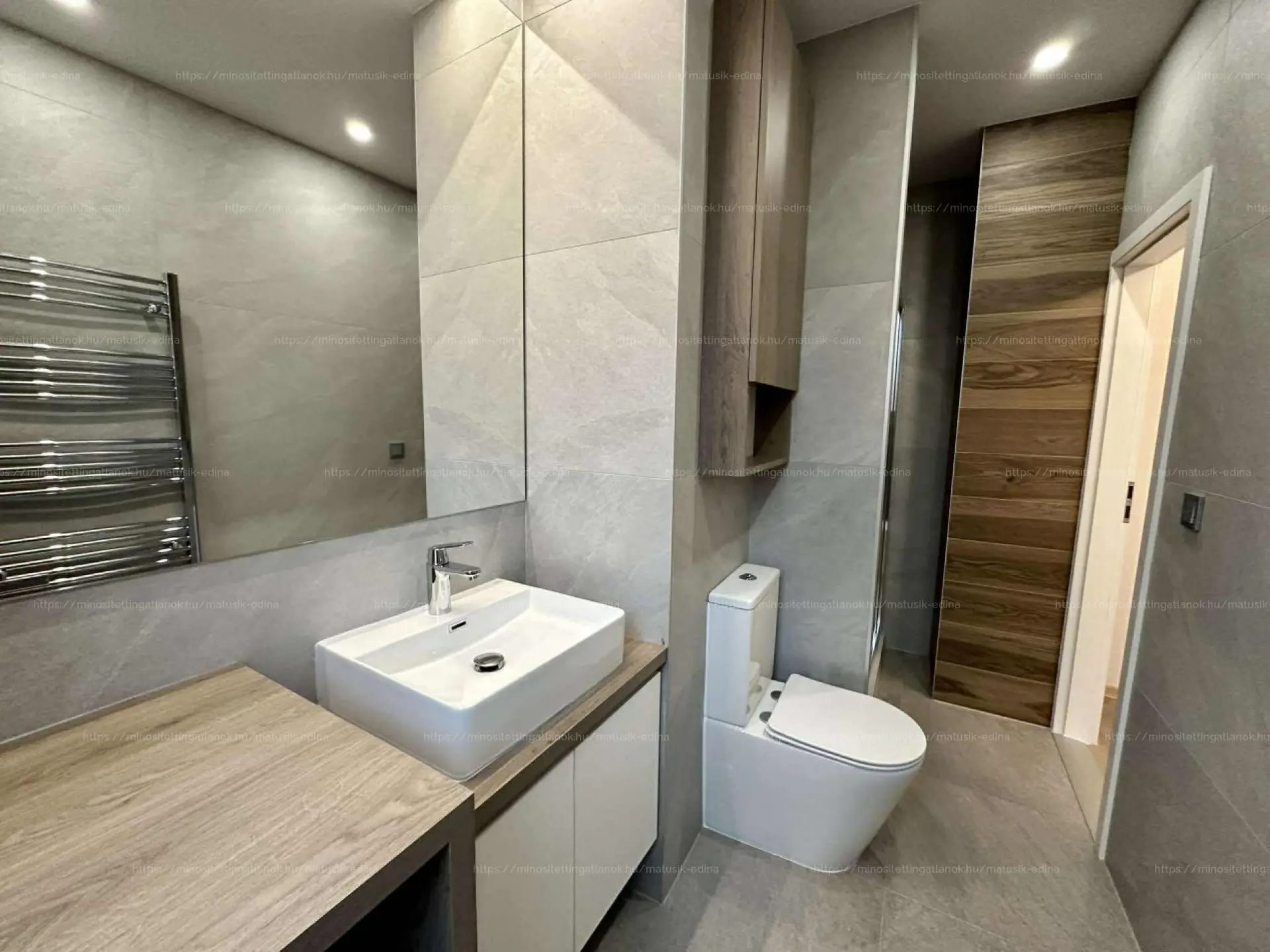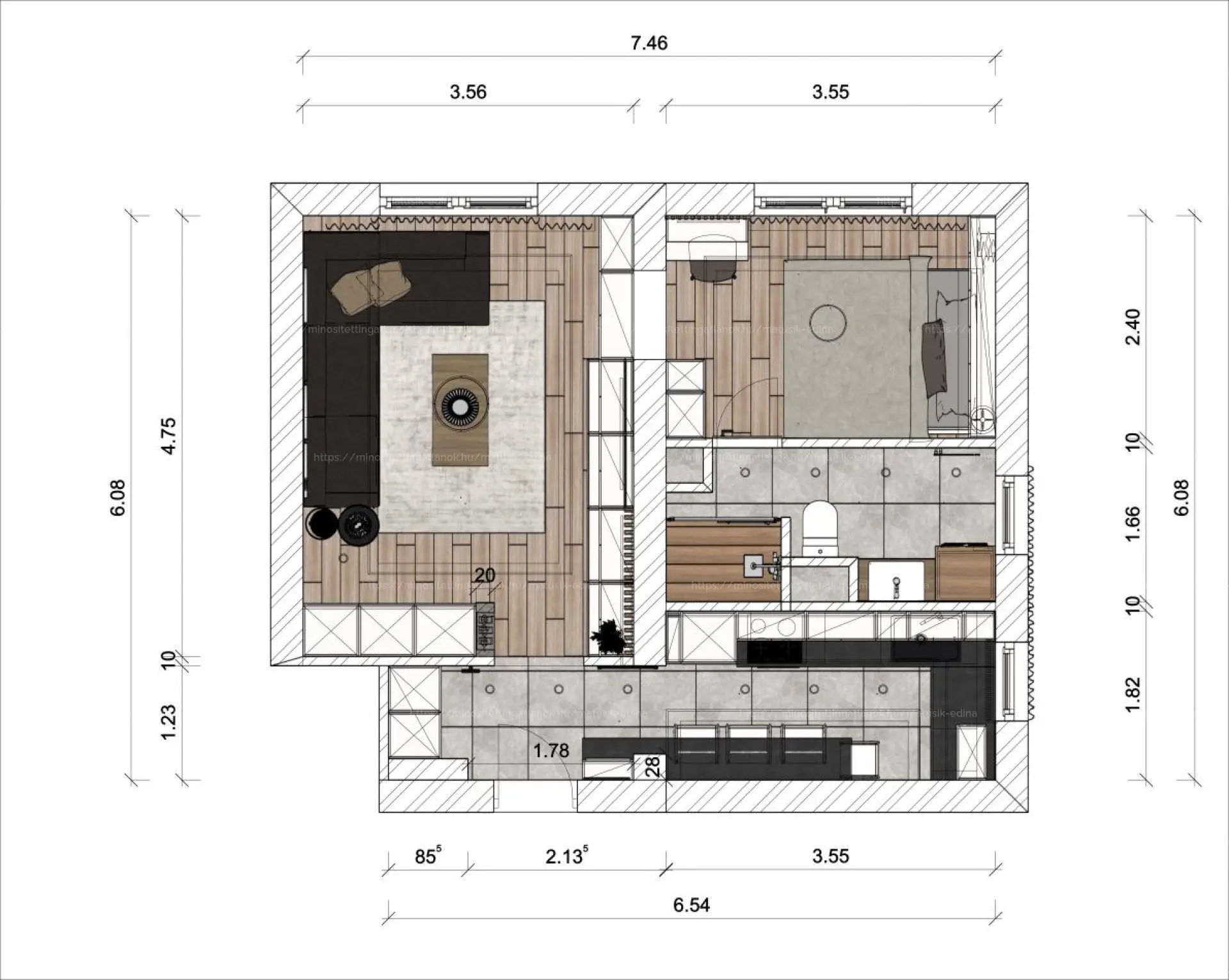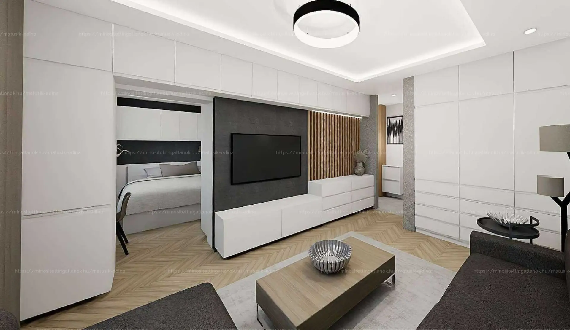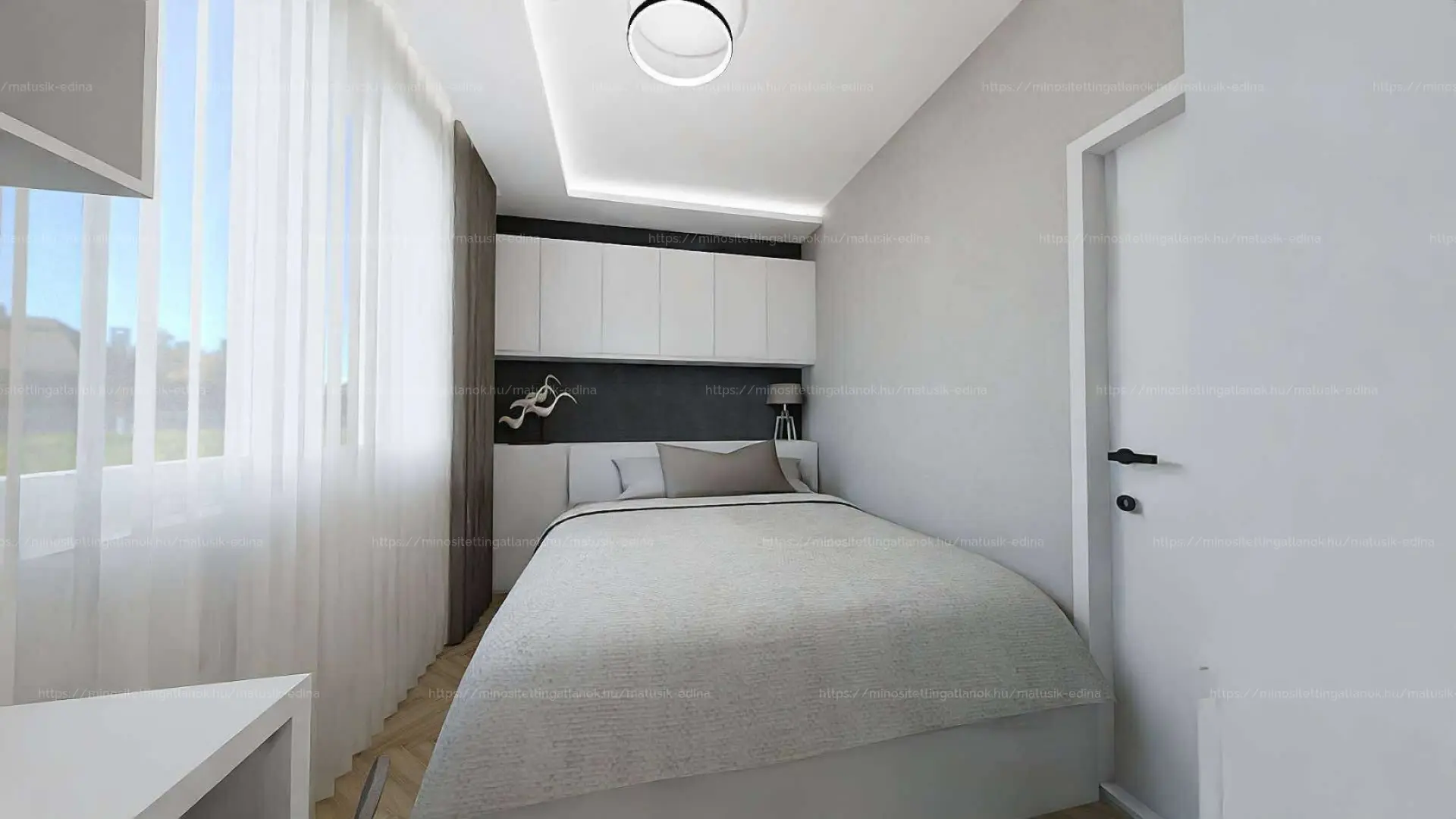 A tágas nappaliból egy kényelmes hálószoba nyílik, illetve a zuhanyzós fürdőszoba, melyen ablak is van. A fürdőben igényes szaniterek találhatóak.