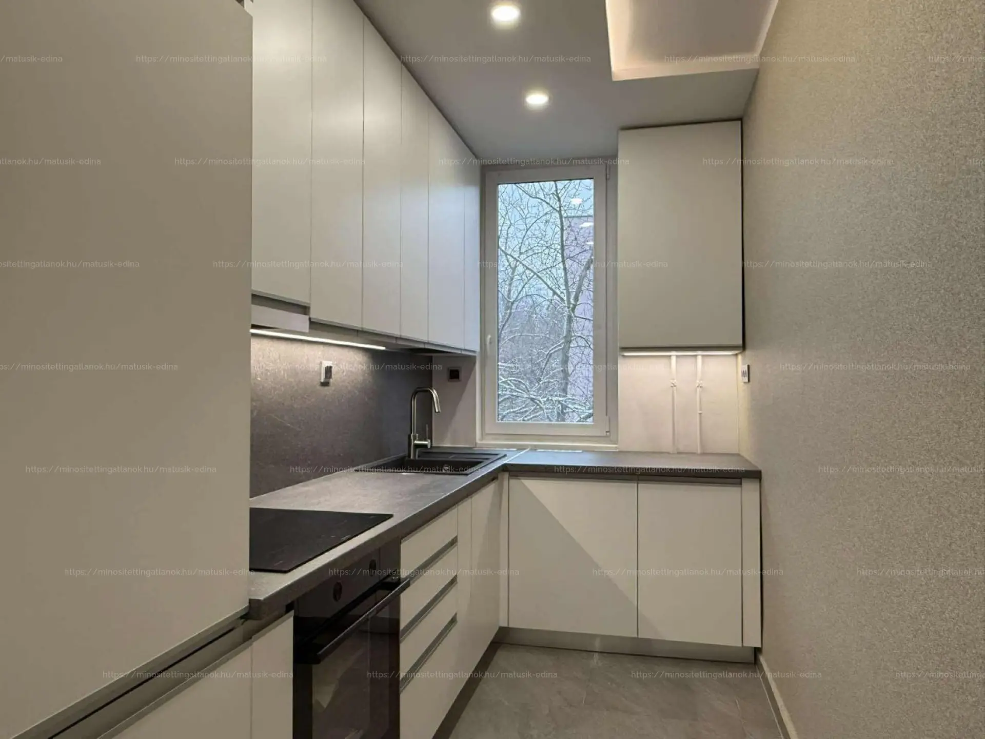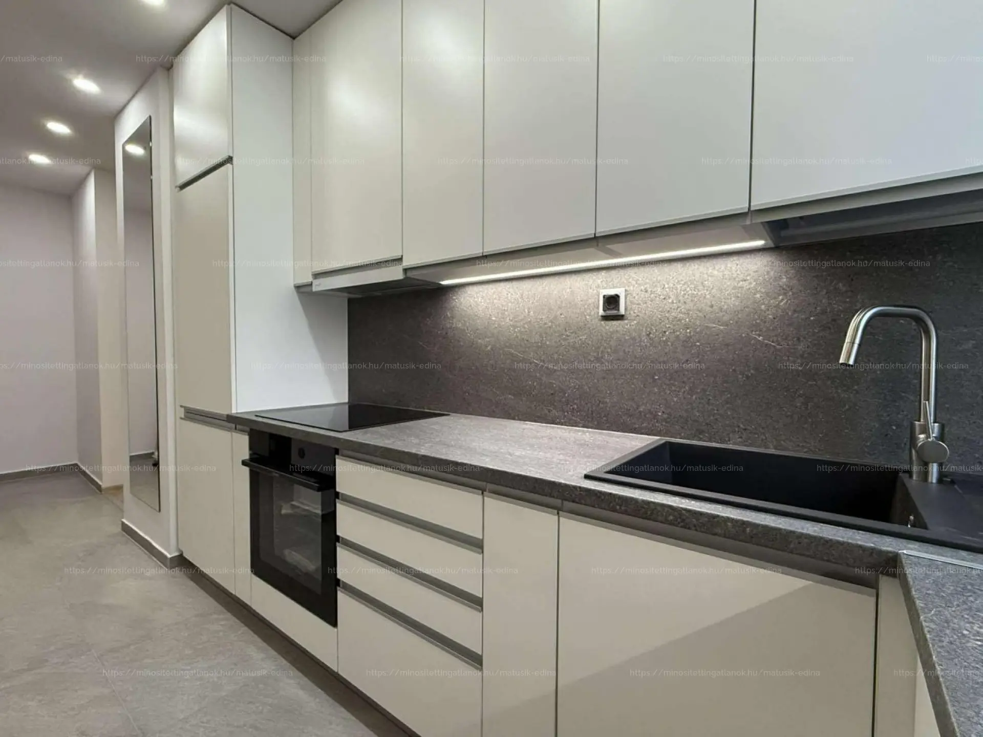 A konyhabútor rengeteg pakolófelületet rejt, a páraelszívó is kivezetésre került, igényes konyhagépek lettek beépítve (mosogatógép, beépített hűtőszekrény, gránit mosogató, kerámia főzőlap és elektromos sütő).