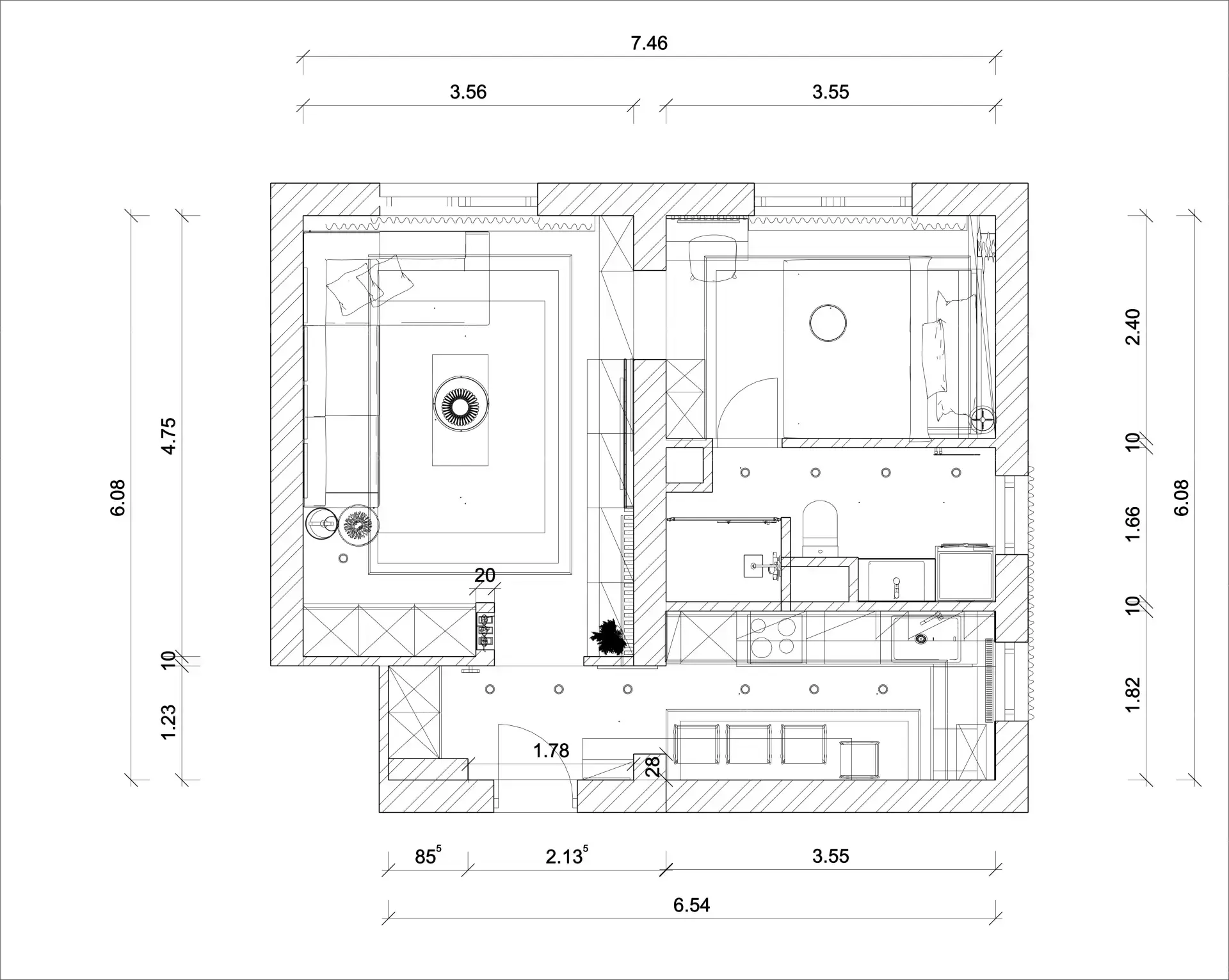 A 43 m2 minden négyzetcentimétere egy ügyes tervező munkáját dícséri, teljes helykihasználással.