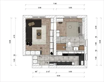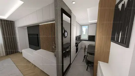 A 43 m2 minden négyzetcentimétere egy ügyes tervező munkáját dícséri, teljes helykihasználással.