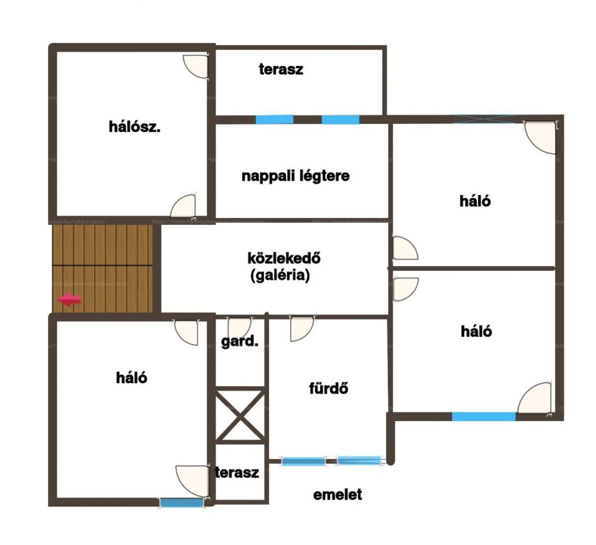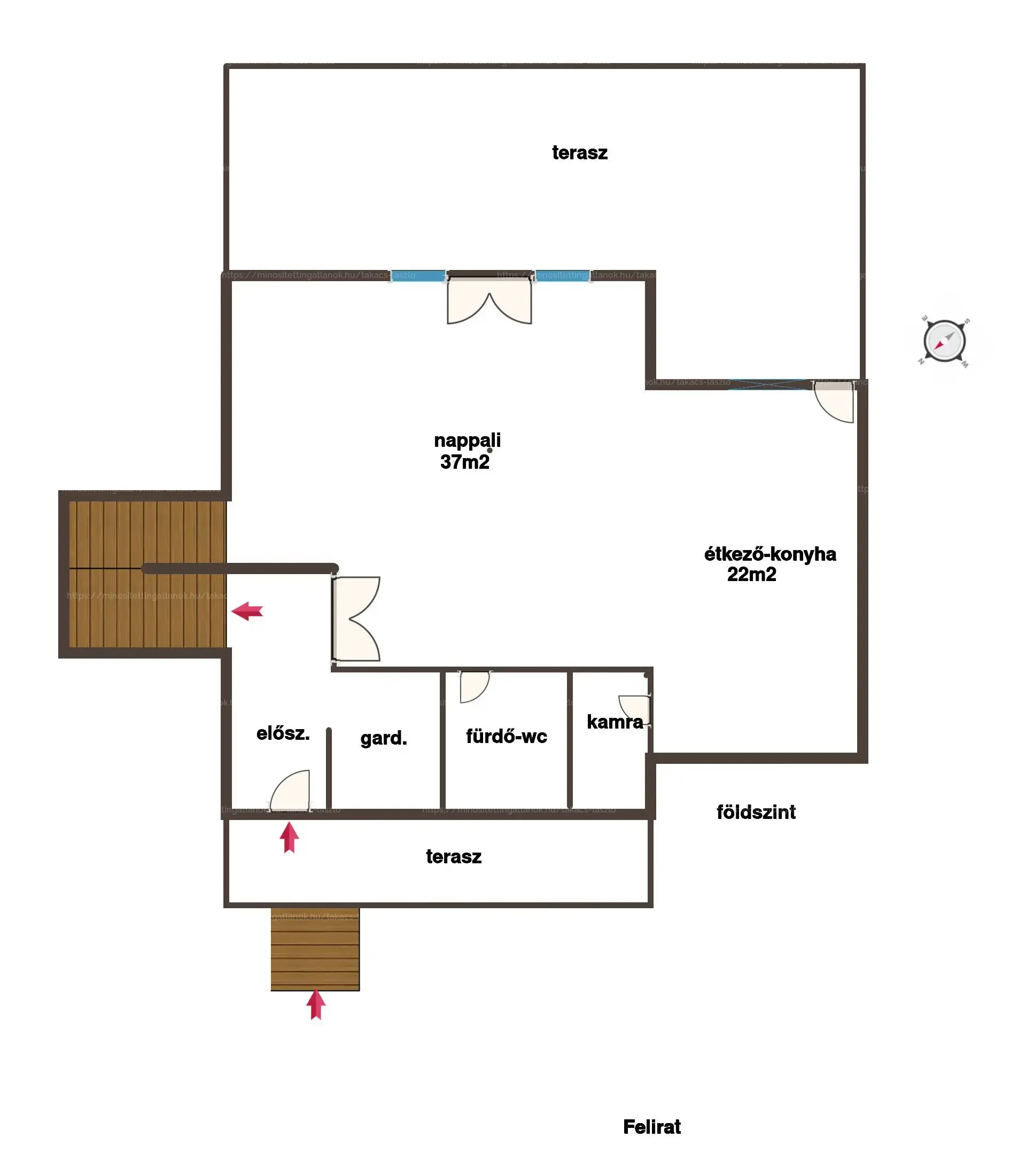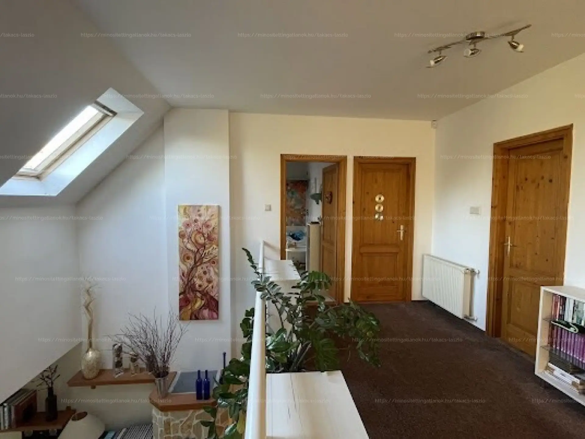 A földszinten tágas nappali vár kandallóval és klímával. Külön étkező szolgálja a kényelmes családi étkezéseket. A konyhához kamra tartozik, ami megkönnyíti a tárolást. A szinten található hálószoba saját gardróbbal és fürdővel. Három WC növeli a napi komfortot.