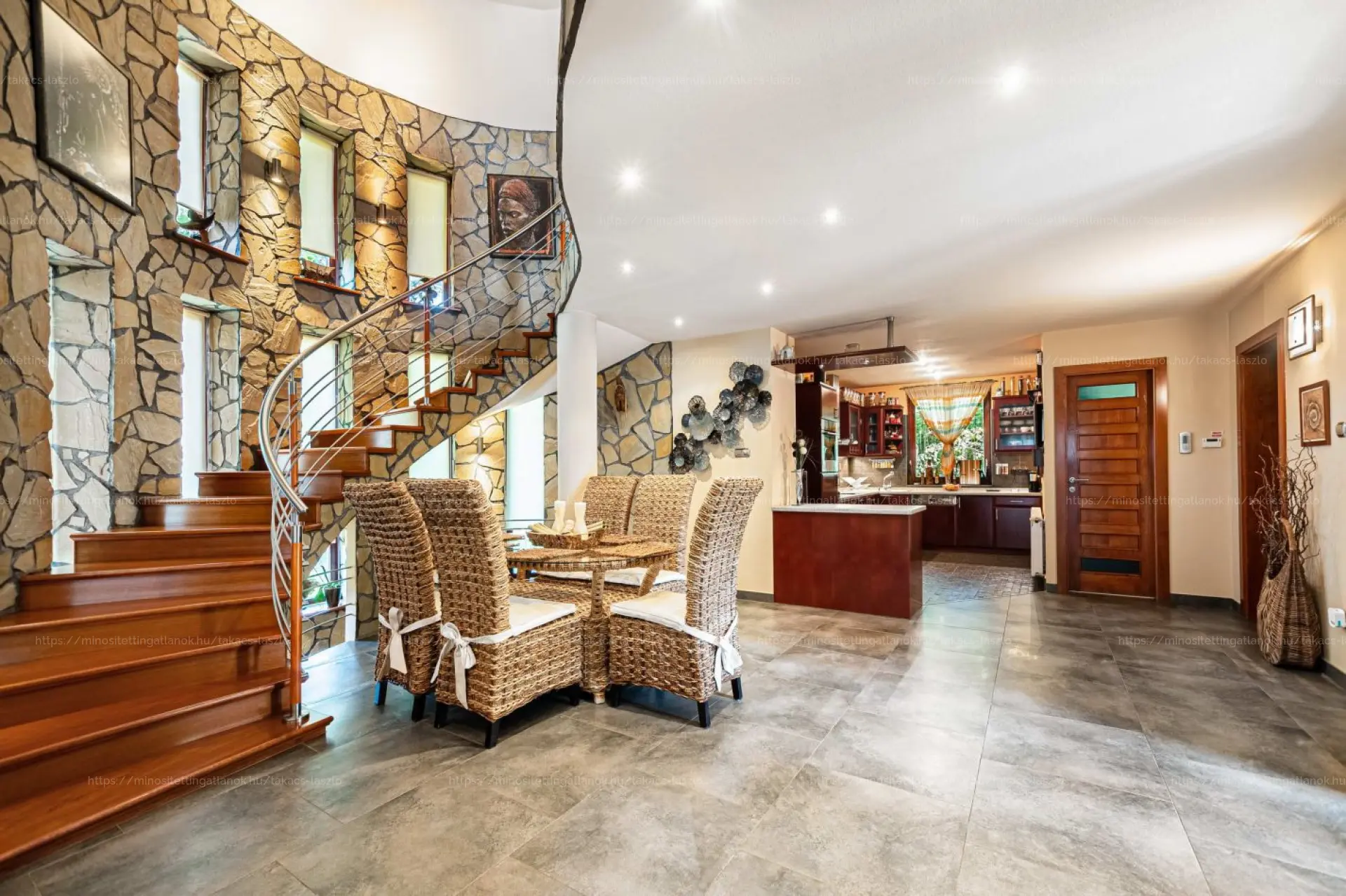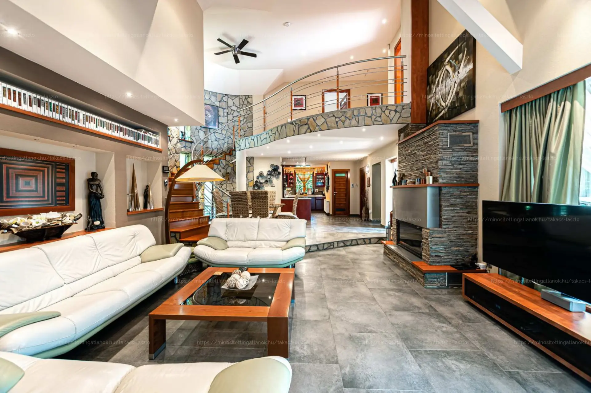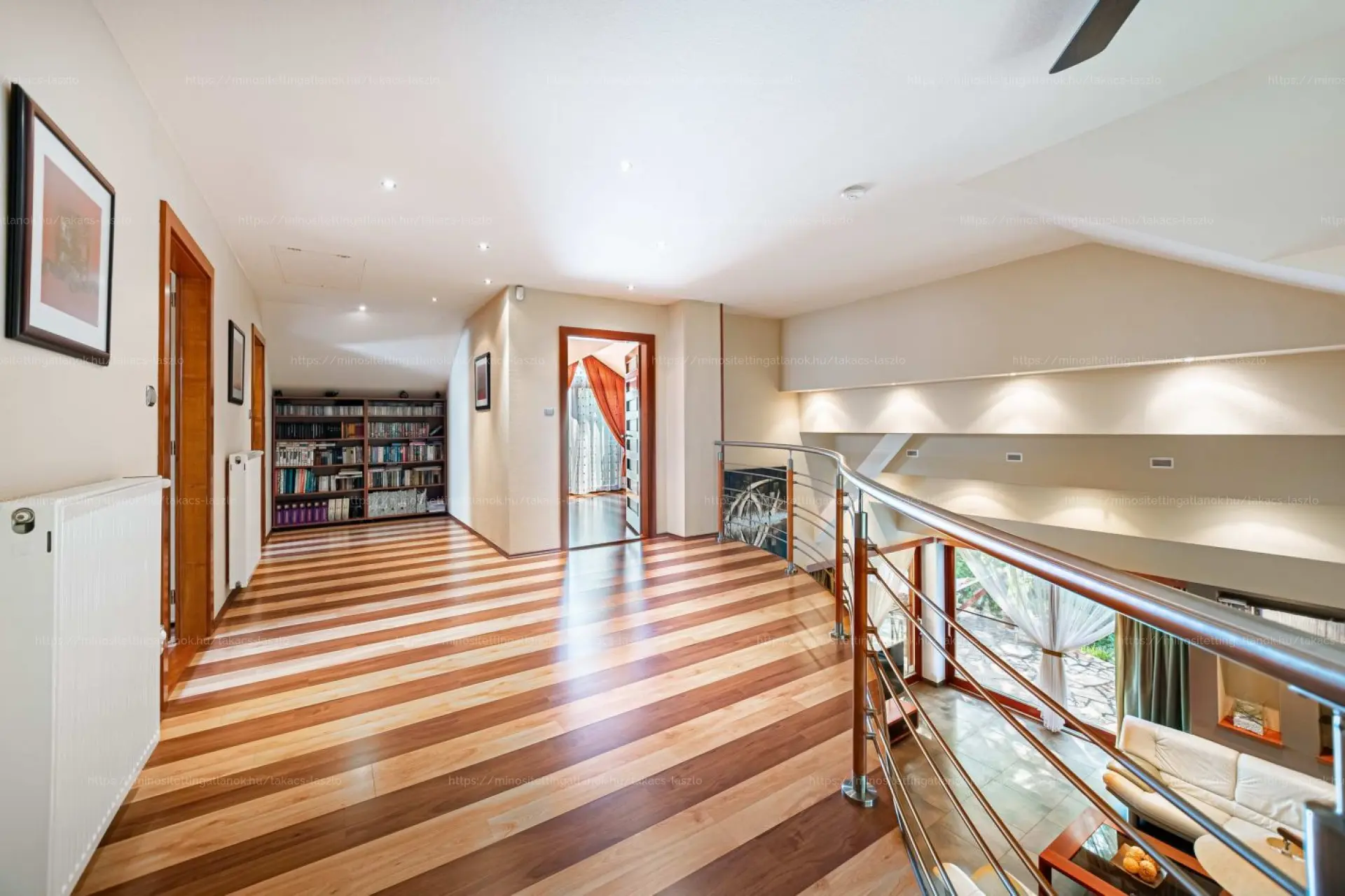 Az emleti galériára gyönyörő cseresznyefa lépcső vezet fel, innen nyílnak...