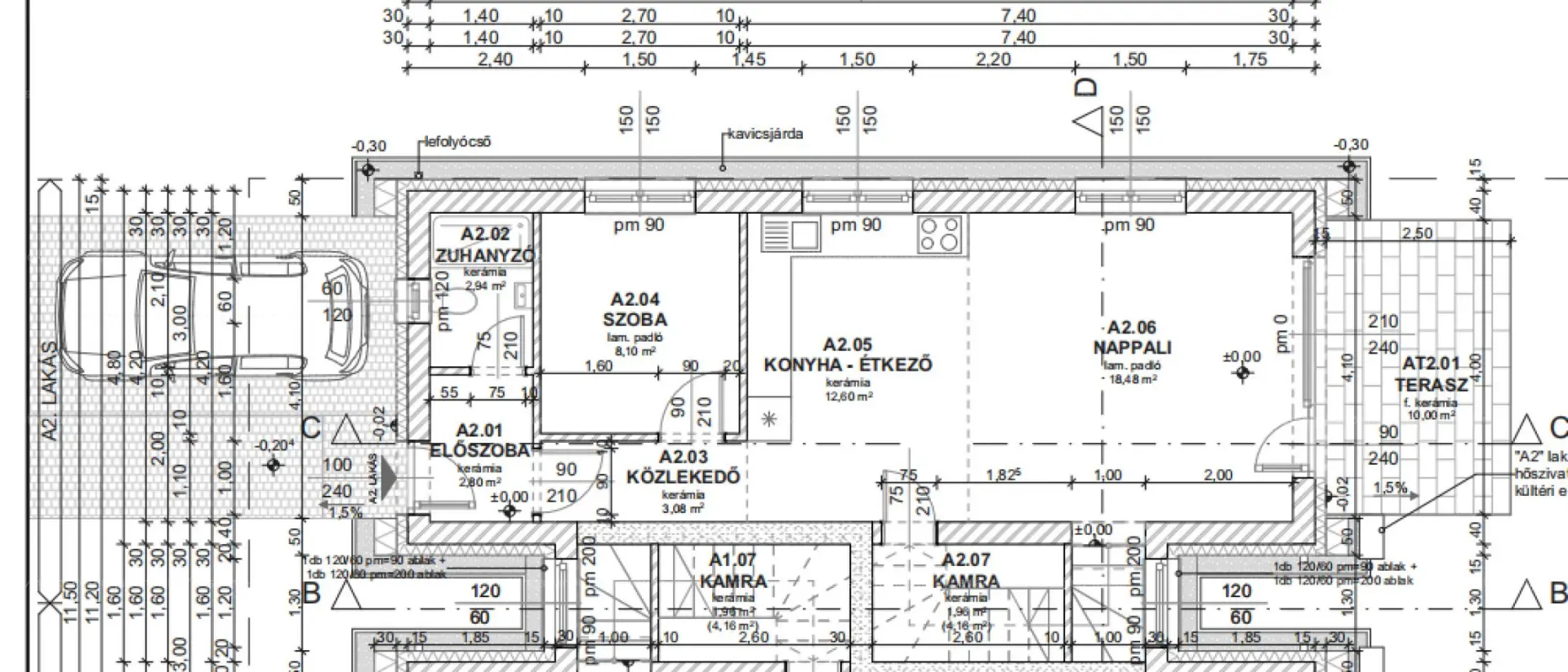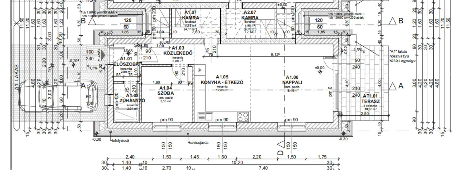 A ház előtt burkolt járda, ahol egy gépkocsi parkolása biztosított.