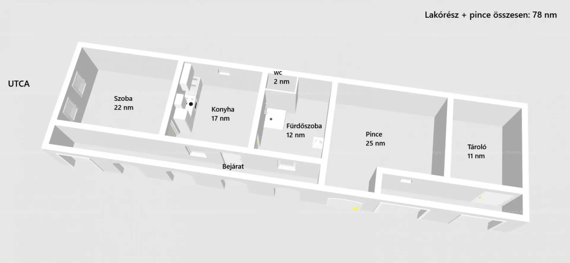 Rendelkezésre áll egy 25 nm-es, boltíves, szép állapotú pince is, mely akár konyhának, külön lakrésznek vagy wellness helyiségnek is kialakítható.