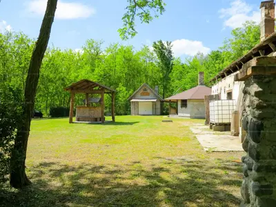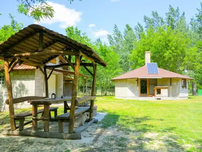 - főépület: könnyűszerkezetes, szigetelt, 40 m2-es alapterületű, napelemmel ellátott, kályhával fűtött; elosztása: konyha + étkező, hálószoba, tároló