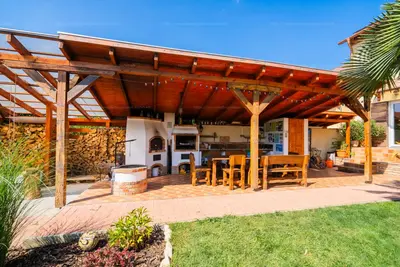 - 30 m² fedett grillterasz konyhával, kemencével, bográcsozóval és külön WC-vel