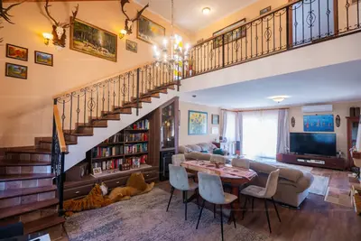 Hatalmas, galériás nappali: 50 m², konyhával és étkezővel együtt kb. 80 m²
