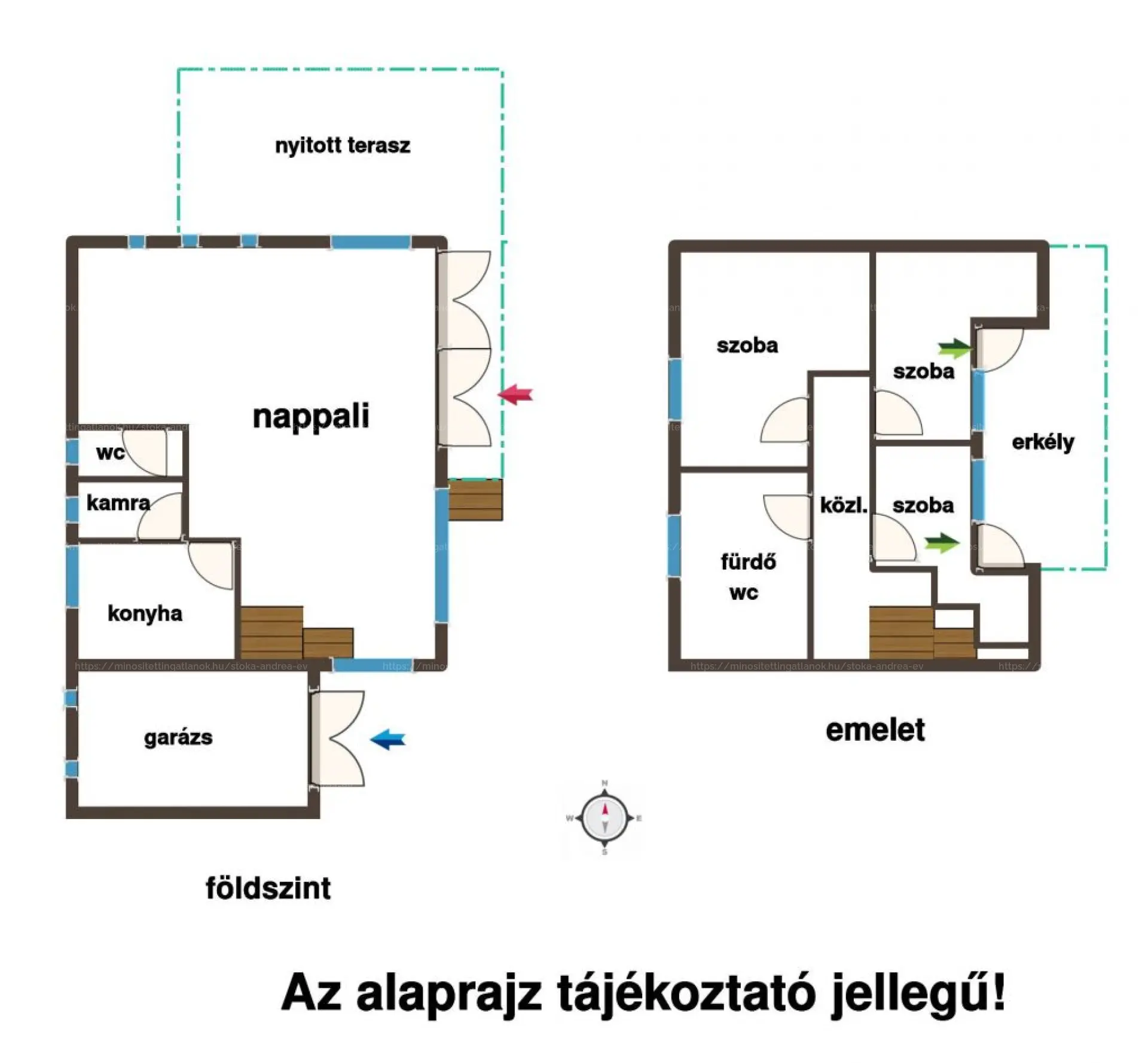 A földszinten tágas, napfényes nappali (32 m2), konyha, kamra és wc-kézmosóval lett kialakítva, az emeleten három félszoba és fürdőszoba-wc található. A két szintet összekötő lépcső kellően tágas, kényelmes közlekedést biztosít.