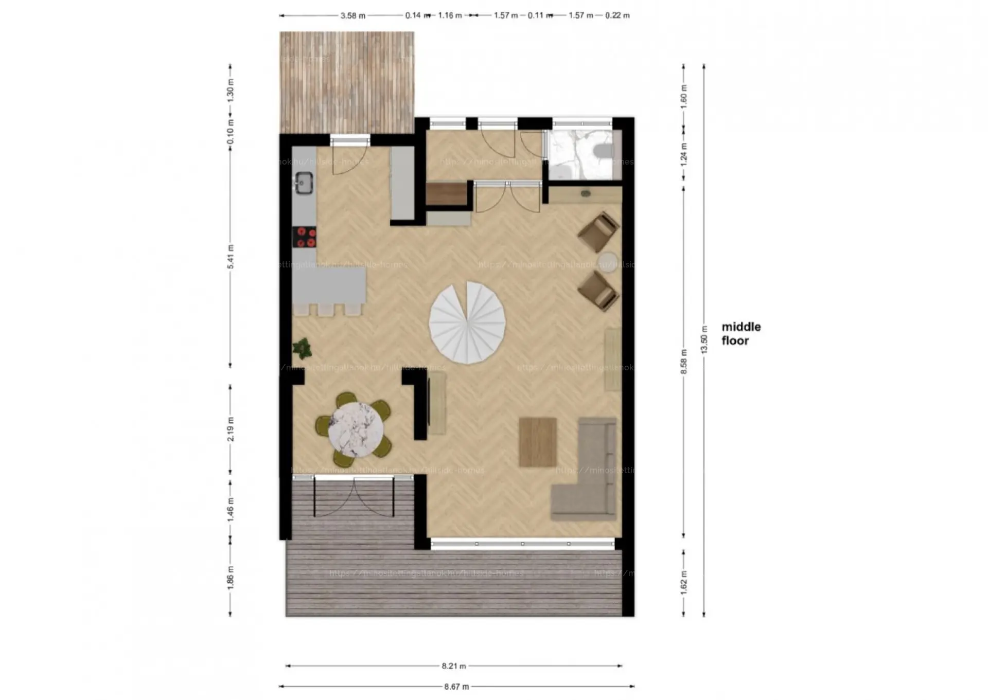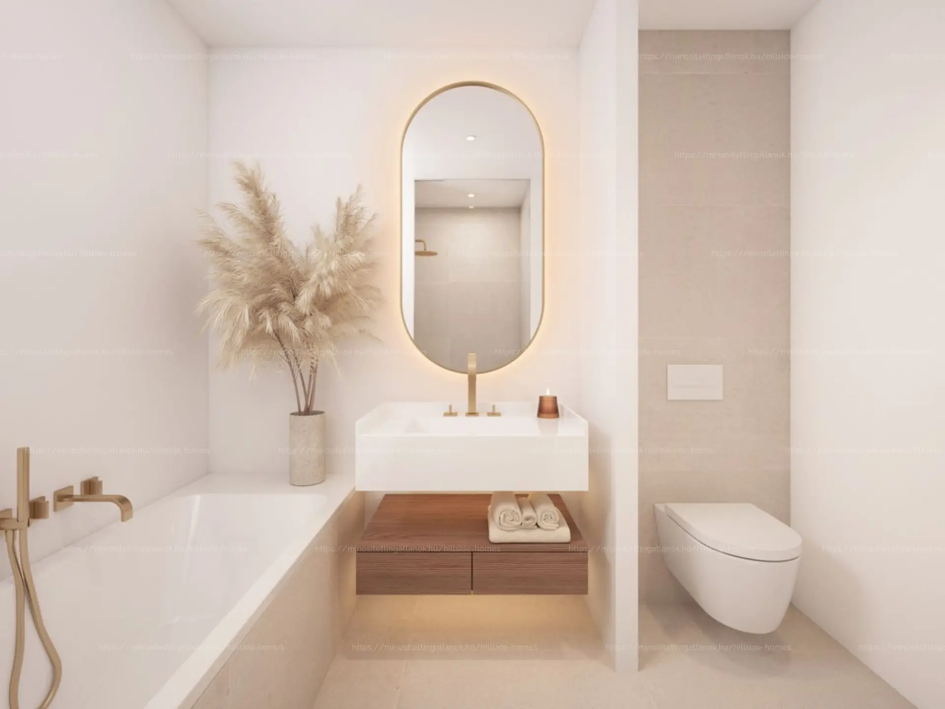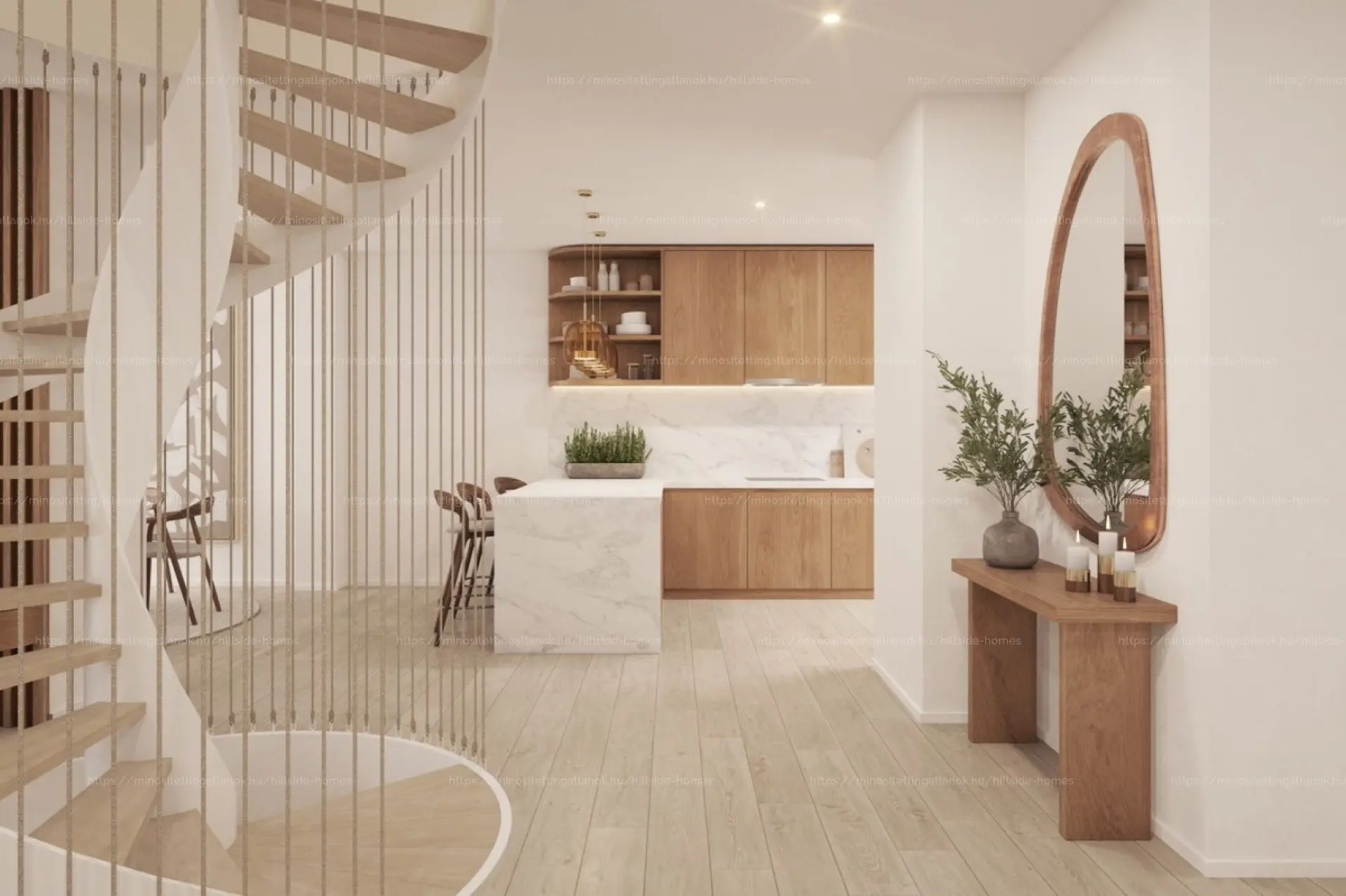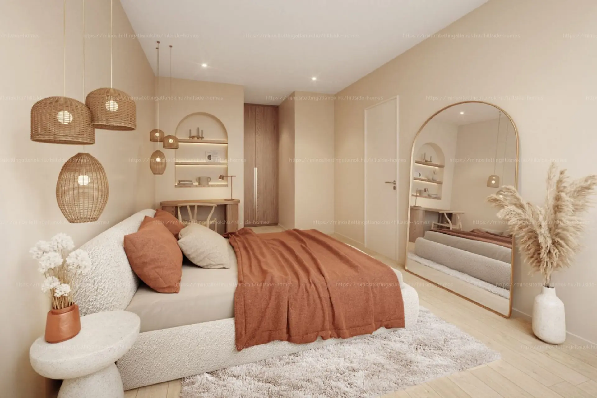 A hirdetésben szereplő képek látványtervek, amelyek egy lehetséges, átgondolt belsőépítészeti koncepciót mutatnak be. Az alaprajzok szintén az átalakított elrendezést szemléltetik, ezzel is segítve a térben rejlő lehetőségek elképzelését.
