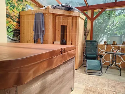 A terasz kiválóan alkalmas kikapcsolódásra, mivel ott kapott helyet egy szauna és egy jakuzzi is, melyek az ár részét képezik!